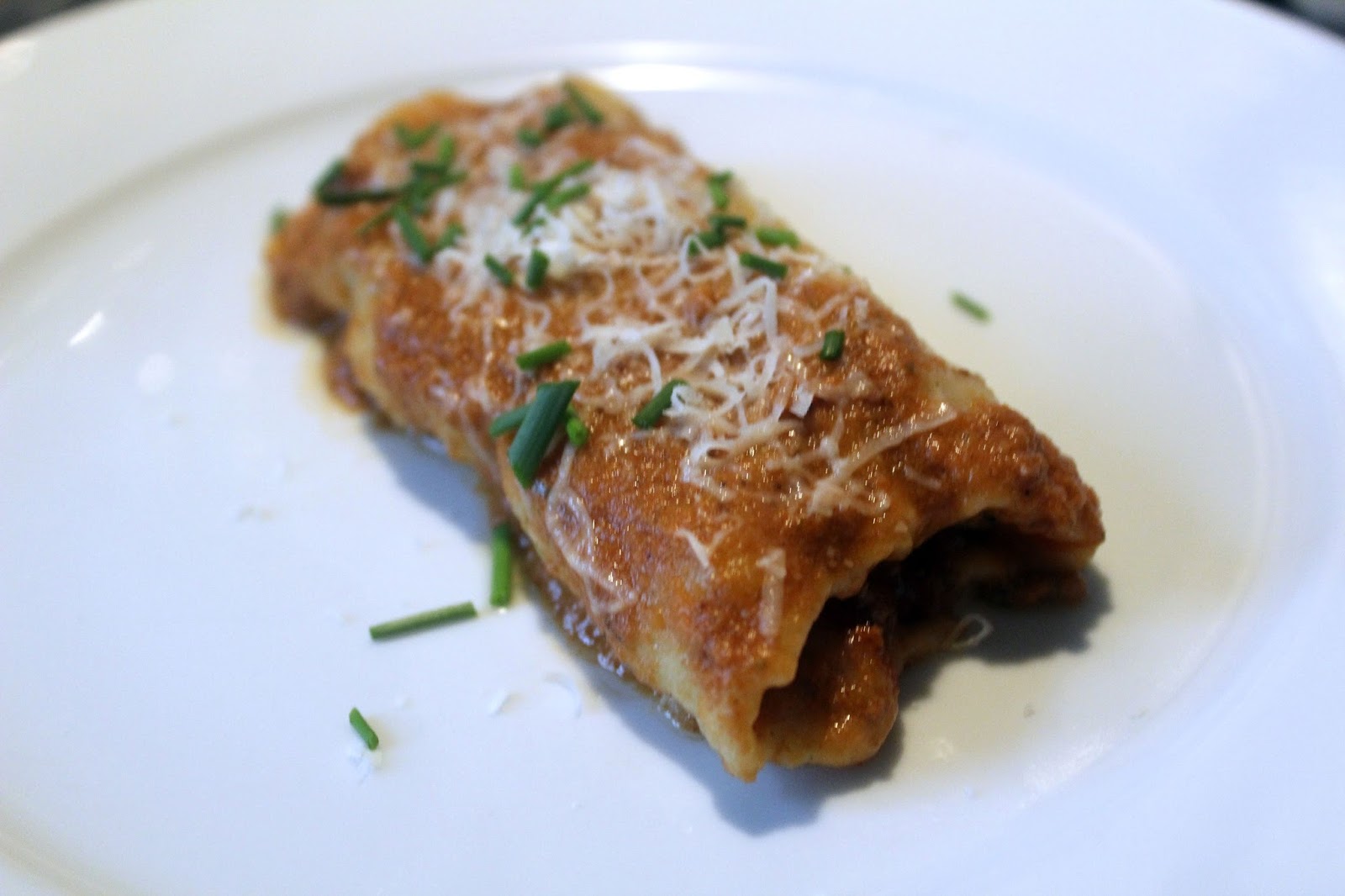 Cannelloni vorsichtig mit dem Pfannenwender aus der Ofenform heben. Mit geriebenem Hartkäse bereiben und mit ein bisschen frischem Schnittlauch bestreuen.