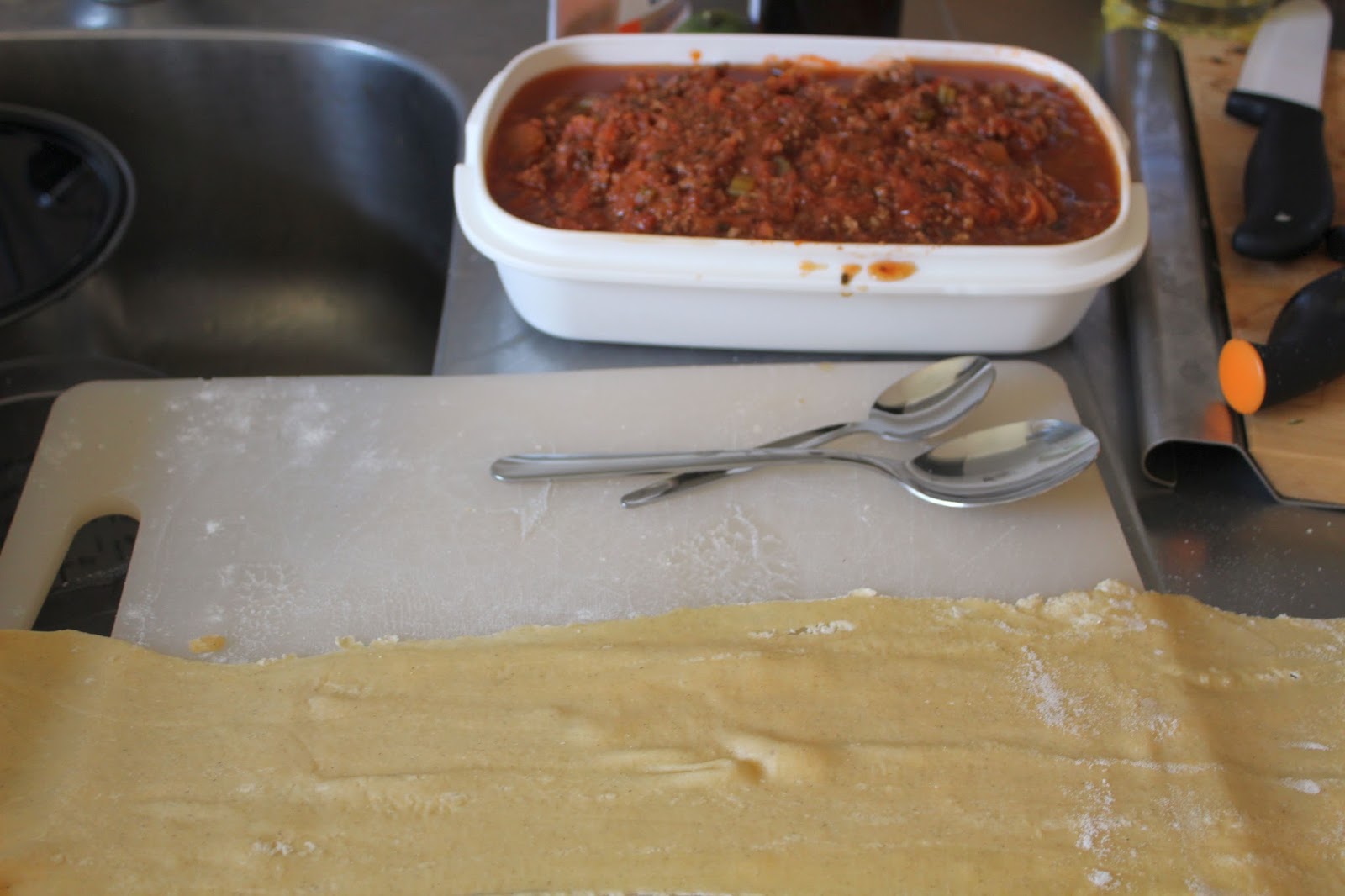 Cannelloni selbst gemacht. Die fehlten mir auch noch im Programm. Die Bolognese habe ich aus einer frisch gewolften Rinderhüfte gemacht. Da kann man natürlich auch einfacheres Fleisch nehmen, aber da war ich einfach in Verlegenheit das Fleisch verbrauchen zu müssen, weil jedes Mal wenn ich damit irgendwas machen wollte, ging die Tür auf und ein Kind kam rein. Danach musste ich dann wechselweise drei Stunden in die Notaufnahme fahren, um Arme eingipsen zu lassen, oder Säuglinge vier Stunden im Arm halten, bis sie eingeschlafen waren. Es waren echt nicht die sechs Minuten in der Pfanne drin, um das Fleisch zu verarbeiten, spätestens beim Essen, hätte dann wieder jemand gestört. Da habe ich dann einfach mitten in der Nacht, als endlich keiner mehr stören wollte, angefangen die Bolognese zu kochen, mit dem Vorsatz endlich mal selbst Cannelloni, mit selbst gemachtem Nudelteig zu produzieren.