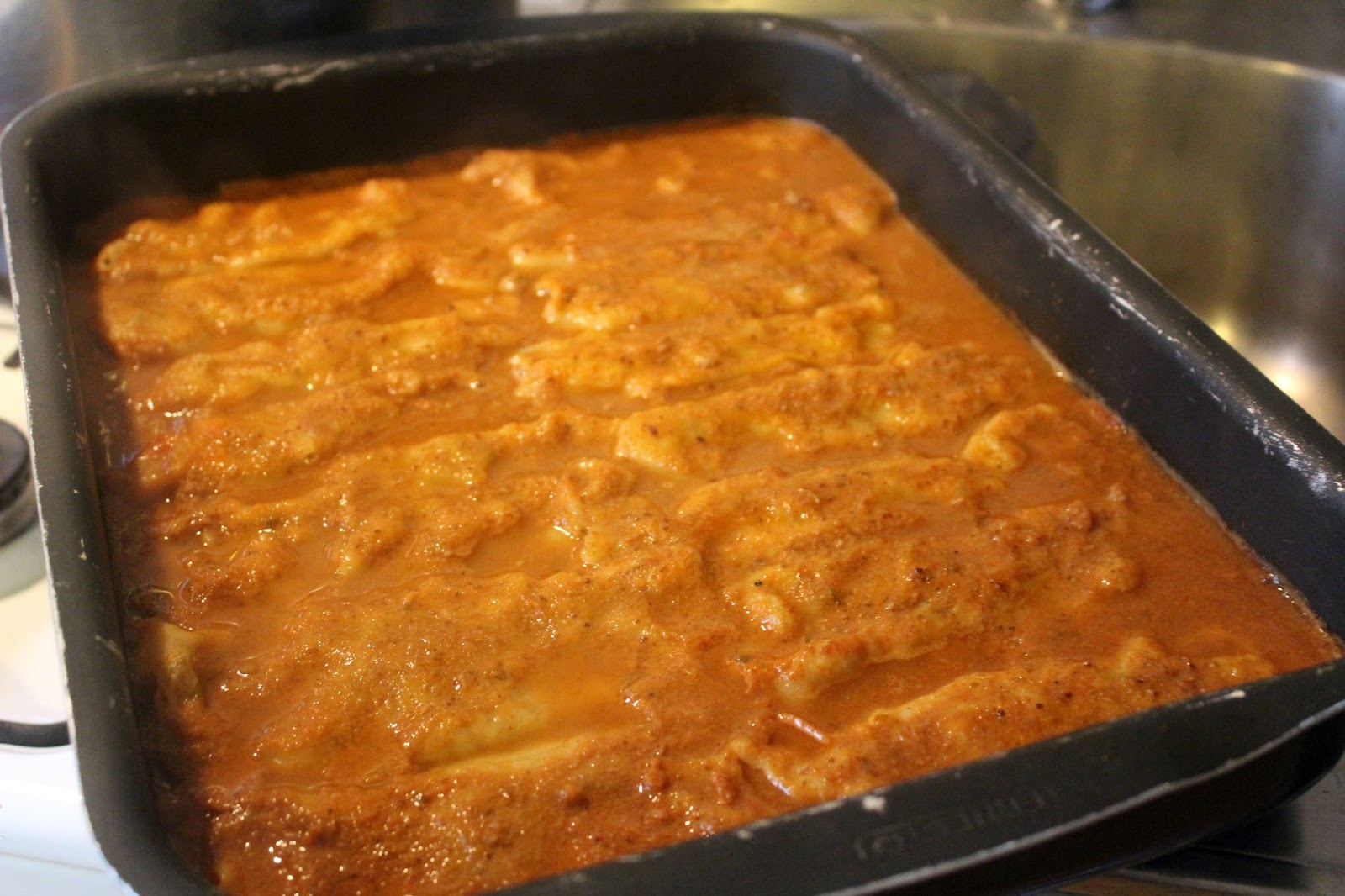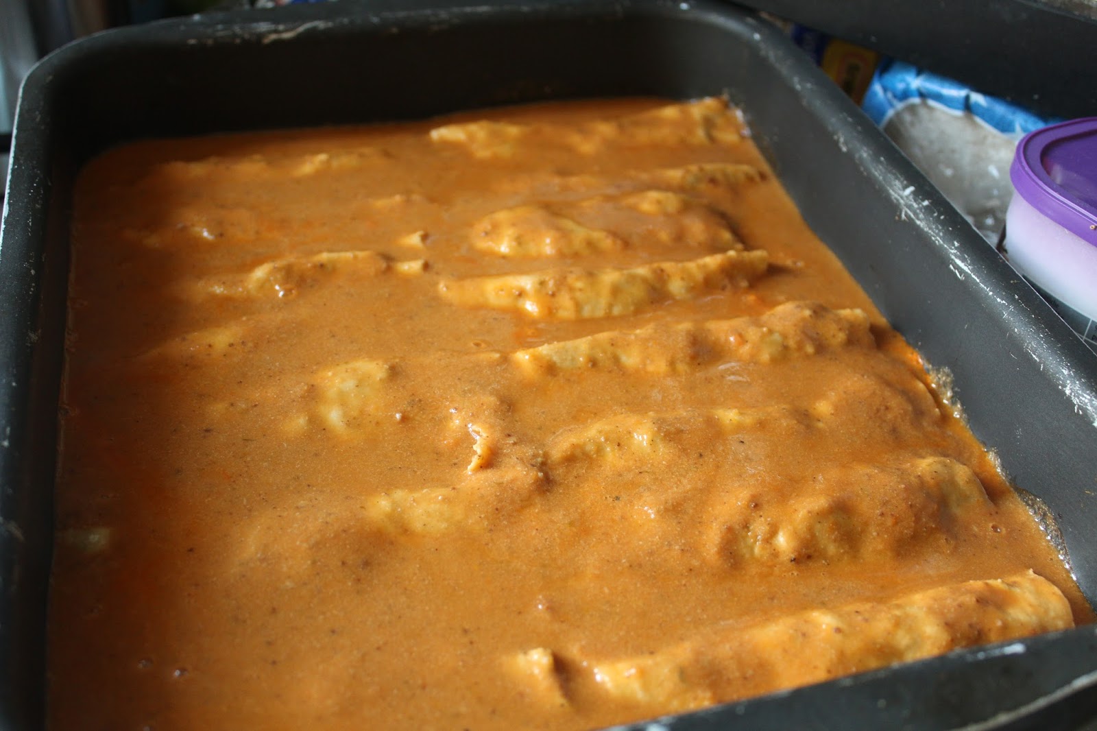 Die Soße über die Cannelloni kippen und die Cannelloni für 45 Minuten bei 200 Grad in den Ofen stellen. Ich habe ja nur einen Gasofen mit Unterhitze. Ihr werdet 180 Grad brauchen, wenn Ihr auch Oberhitze habt und höchstwahrscheinlich in dem Fall auch nur 30 bis 35 Minuten