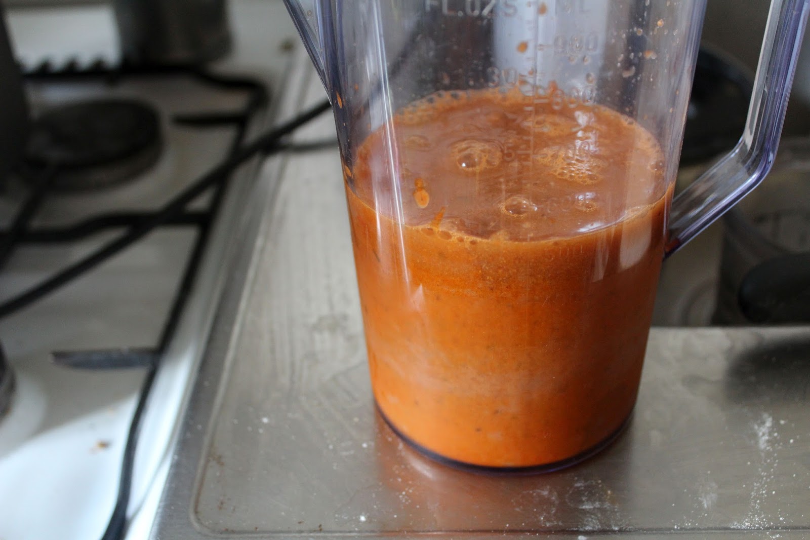 Ich hätte jetzt eine separate Tomatensoße machen können, aber mein Gedankenansatz ist, dass ich in der Soße die gleiche Basis haben möchte wie in der Fleischfüllung, damit es sich wie aus einem Guss anfühlt. Deswegen habe ich meinen Rest Bolognese, den ich noch nicht in den Cannelloni habe, in einen Mixbecher gefüllt.