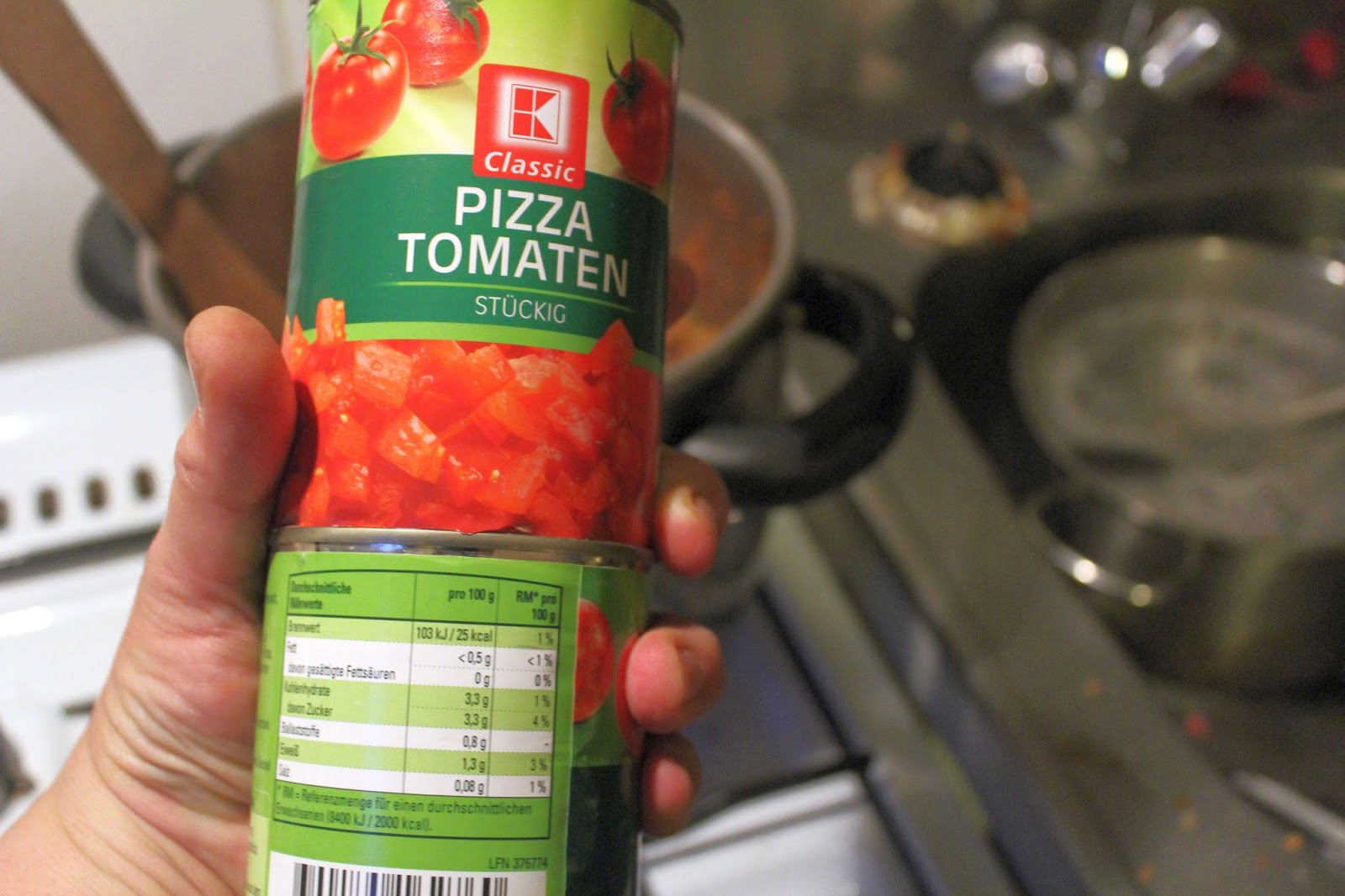 Ich hatte irgendwie gerade keine frischen Tomaten in ausreichender Menge, deswegen mussten es 2 Dosen Tomaten sein. Fällt bei dem Schmorgericht auch nicht weiter auf, außer dass es mein Image schädigt.