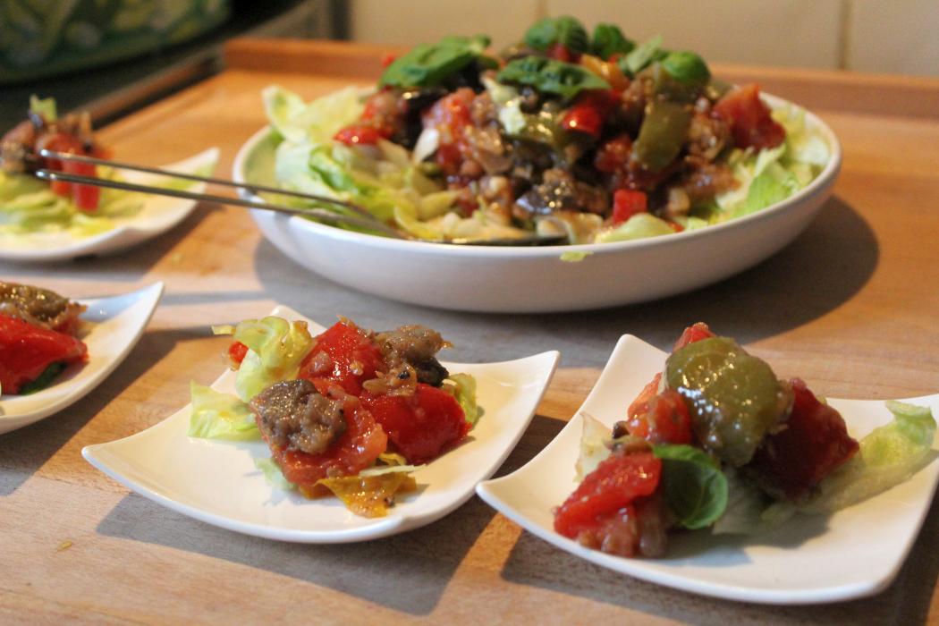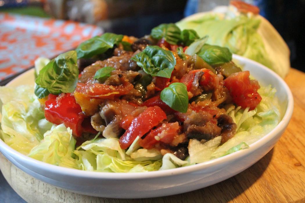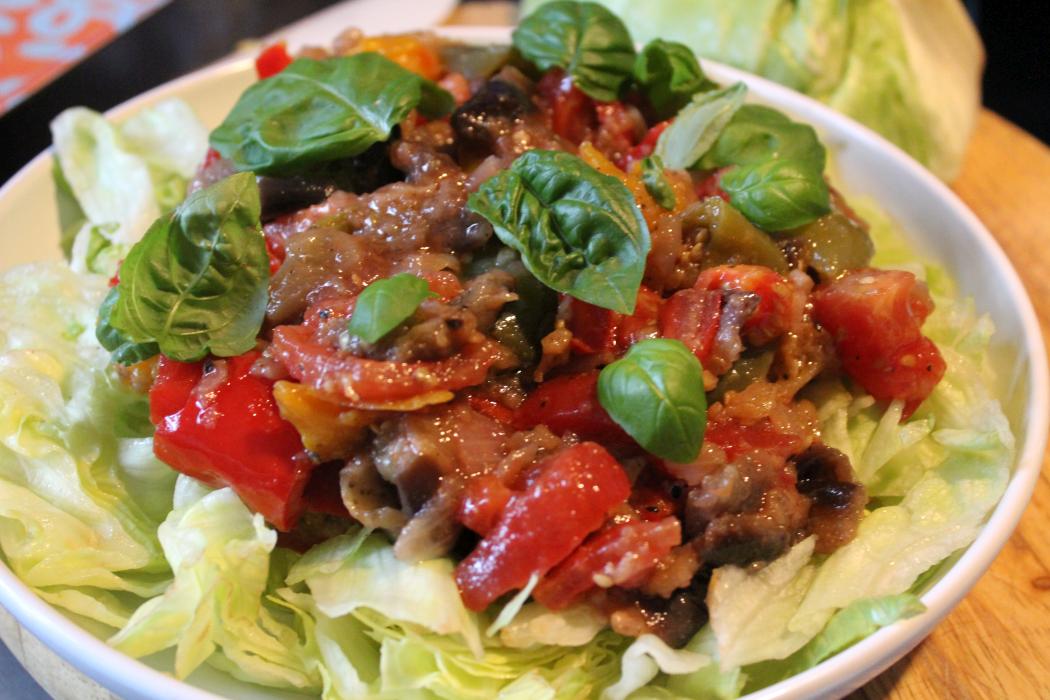 Salat zerkleinern und in einer Schüssel drapieren, die Ratatouille darüber geben und noch ein wenig Basilikumblätter zum Dekorieren.
