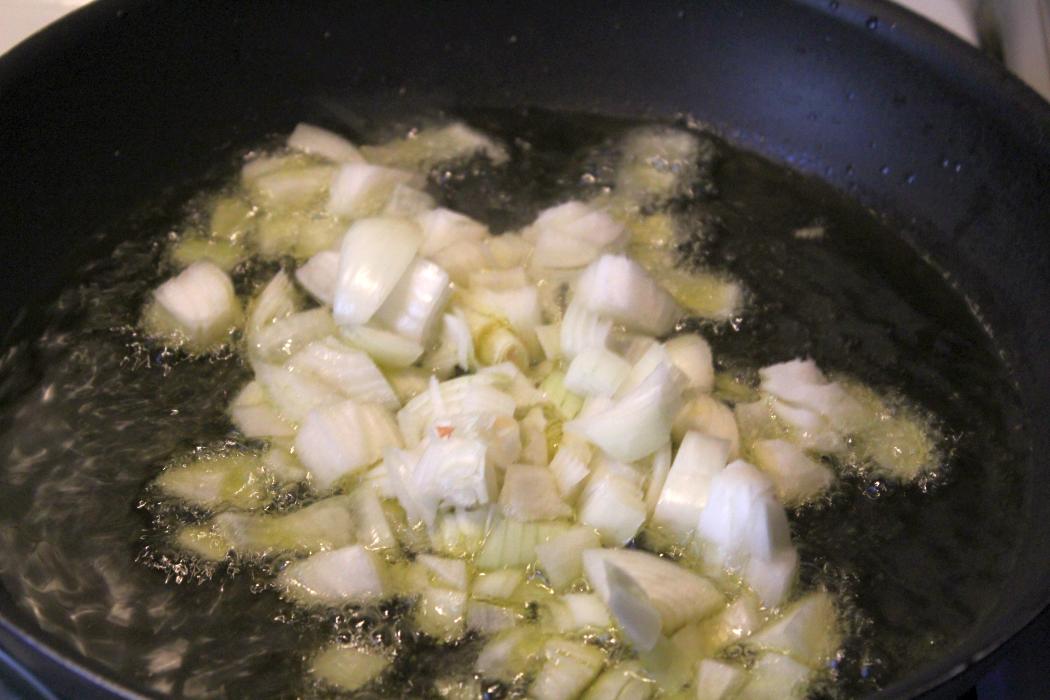 Die Zwiebeln als erstes in die Pfanne geben und glasig braten.