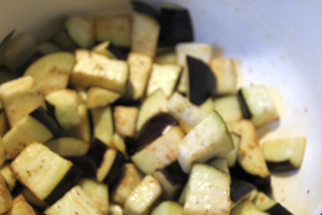 Zwei Auberginen würfeln und in eine Schüssel geben. Salzen und zehn Minuten ziehen lassen, damit die Auberginen Wasser abgeben.
