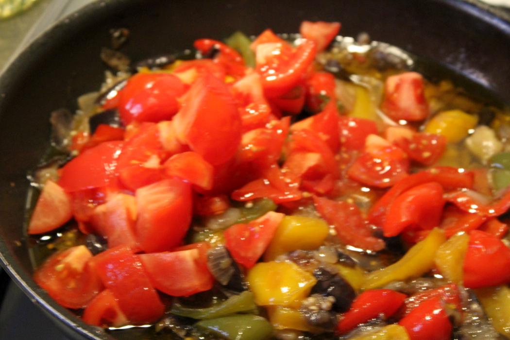 Die Tomaten 5 Minuten bei geringer Hitze in der Pfanne mit dem Gemüse schwenken. Die sollen nicht kaputtkochen, nur leicht anwärmen. So, jetzt kommt das Geheimnis des guten Geschmacks. Das konnte ich nicht fotografieren, weil ich nicht die Pfanne schräg halten und dabei fotografieren kann. Den Großteil des Öls und der gesammelten Flüssigkeit abkippen. Das kann man auch gerne in ein Gefäß machen und als Salatdressing sammeln.