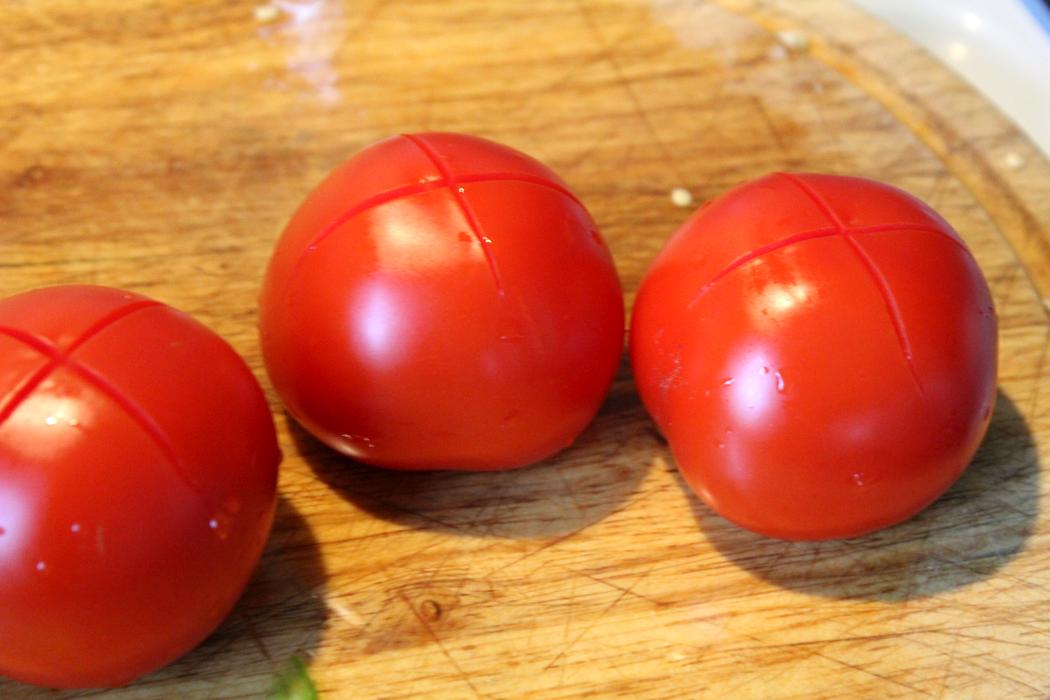 Tomaten auf dem Rücken über Kreuz einritzen