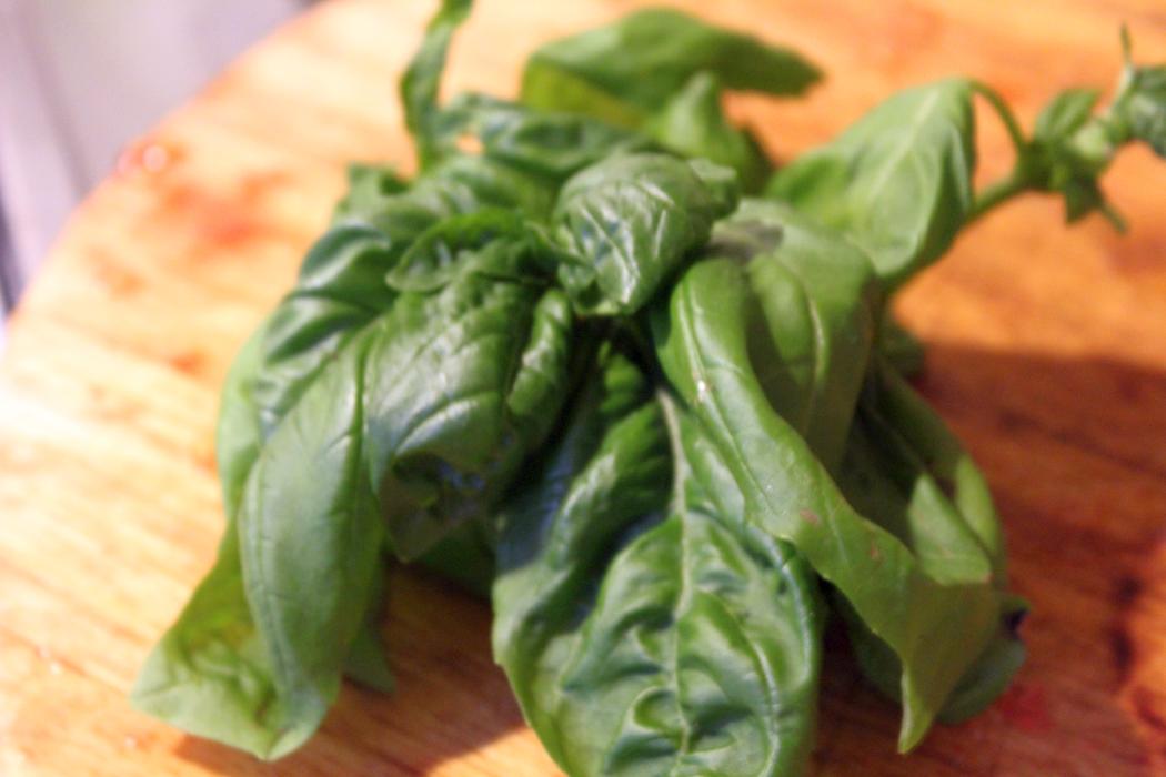 Jetzt sorgen wir für den guten Geschmack der Tomaten. Eine Handvoll Basilikum abzupfen.