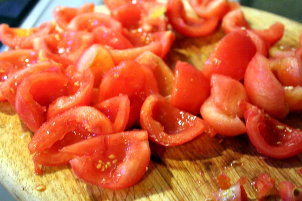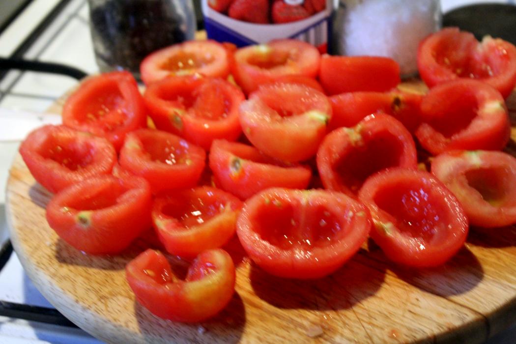 Die entkernten Tomatenhälften noch einmal halbieren, also Viertel daraus machen.