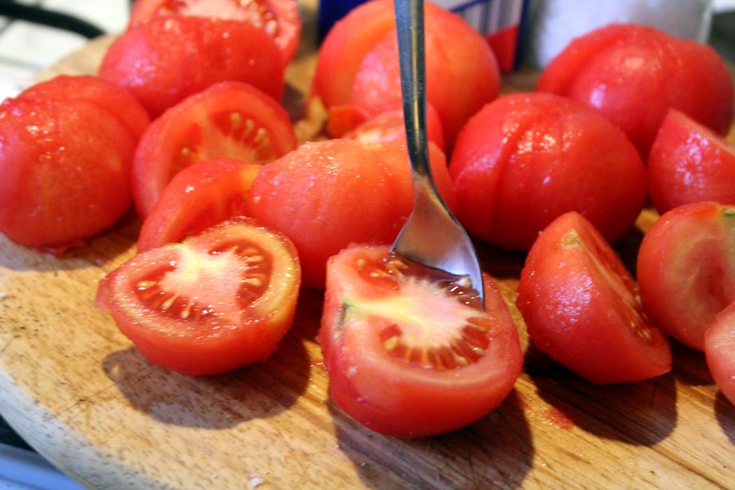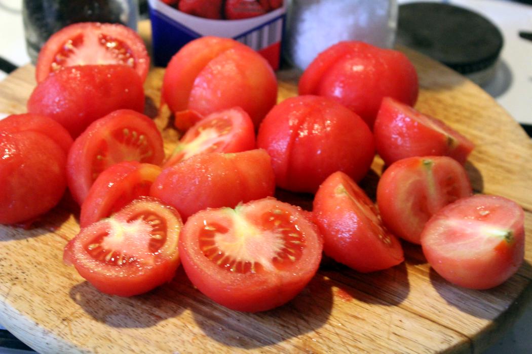 Die Tomaten sollen später beim Garen ein Bett für die Zucchini bilden. Deswegen fange ich mit denen an.