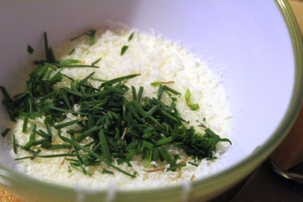 Schnittlauch schneiden und auch in die Schüssel geben.