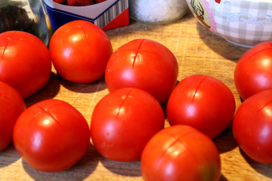 Tomaten auf dem Rücken über Kreuz einschneiden.