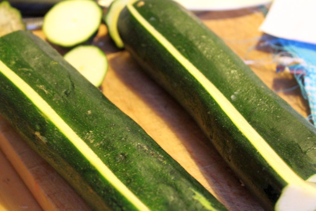 Die halbierten Zucchini drauflegen und mit Salz und Pfeffer würzen. Auch hier gilt, wer nicht vögelt, kriegt kein Kind, sprich wer da kein Gas gibt, braucht sich hinterher auch nicht beschweren, wenn es nicht schmeckt.