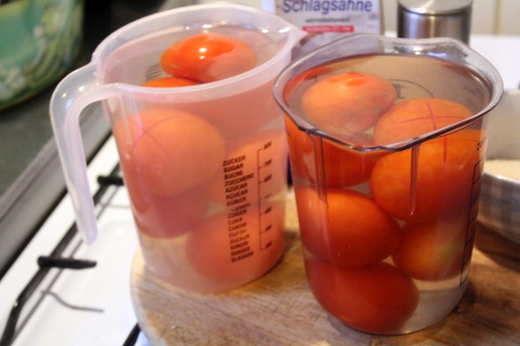 Wasser zum Kochen bringen und dann die Tomaten damit überbrühen.