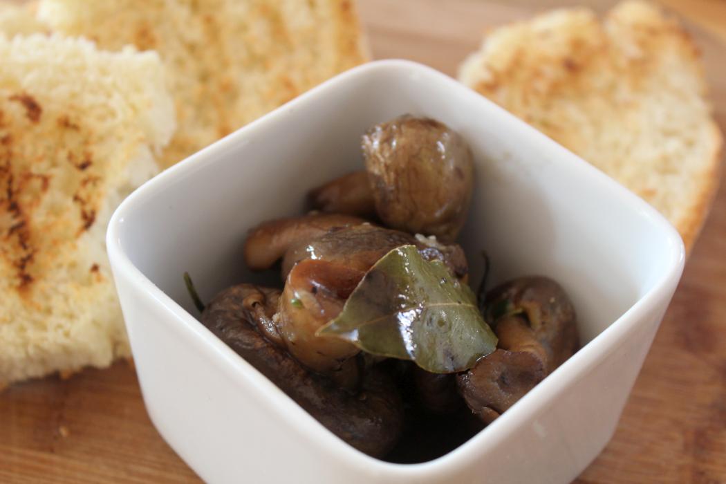 Nach zehn Minuten haben die Champignons reichlich Flüssigkeit abgegeben, die eine leckere Soße zu den Champigons ist. Kein Wunder, weil das Meersalz, Pfeffer, Lorbeerblätter und Rosmarin, plus der Eigengeschmack der Champignons drin ist. Ich würde die Champignons maximal lauwarm, oder kalt servieren.
