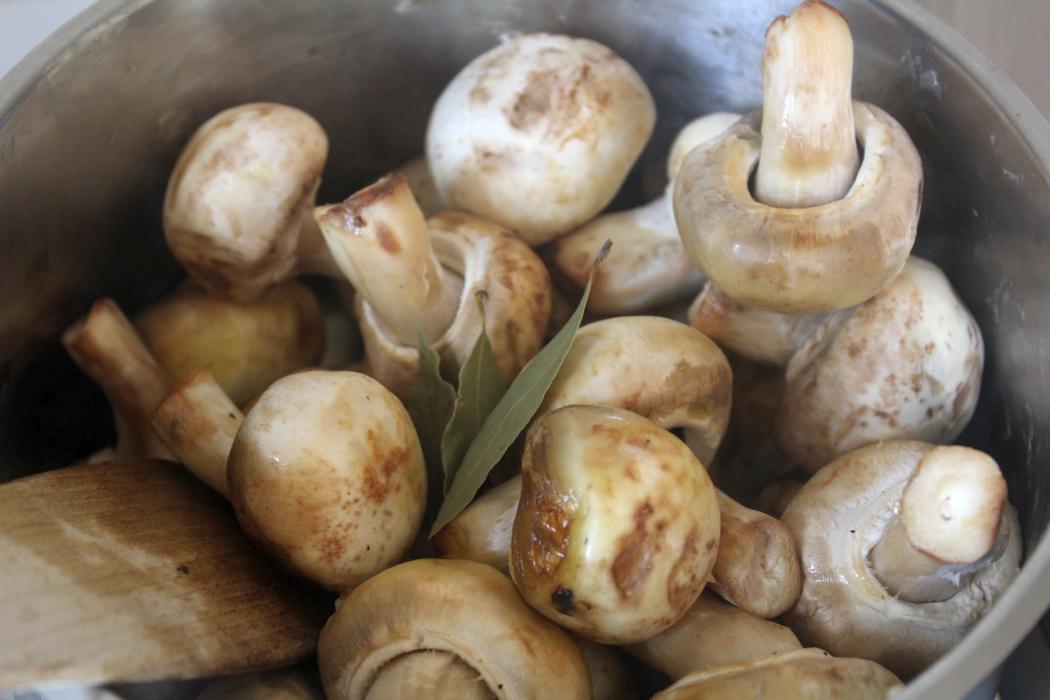 Wenn der Knoblauch glasig wird, kommen die Champignons in den Topf.