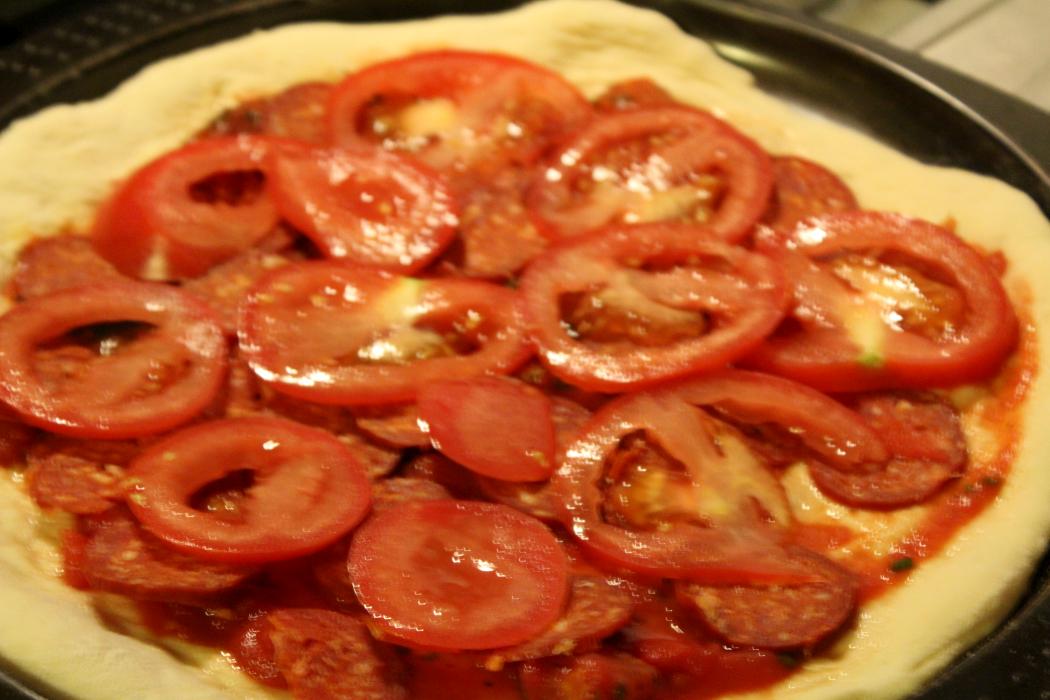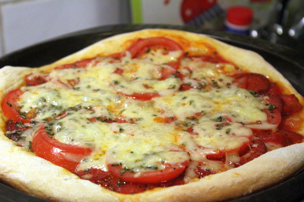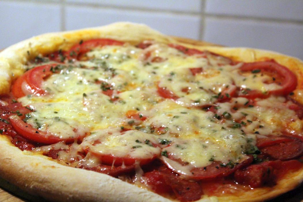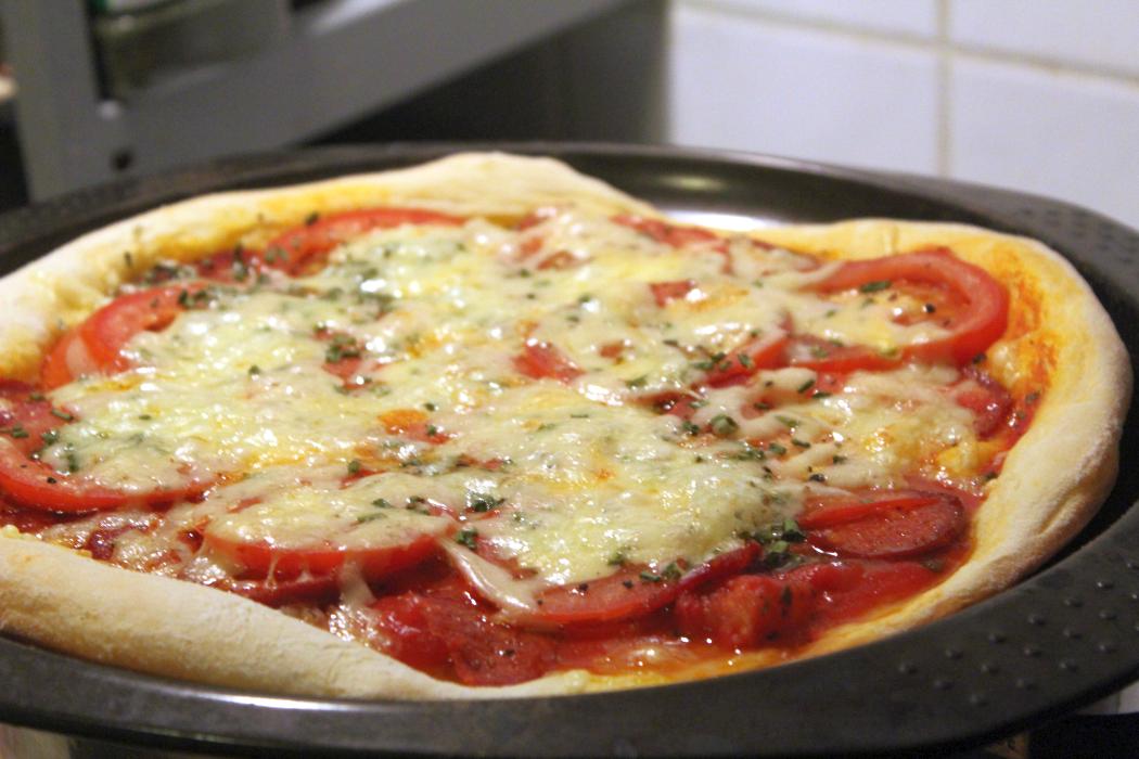 Der Teig lässt sich leicht schneiden, ohne zu bröseln und fühlt sich unter dem Messer gut an. Die Auflage ist lecker, weil die Salami gut schmeckt und die Tomatensoße auf den Punkt ist. Der Teig ist anders, als bei einer traditionellen Pizza und erinnert ein bisschen an amerikanische Pfannenpizza, oder an Pizza Hut, aber wenn es selbst gemacht ist, lasse ich mir sogar das gefallen.