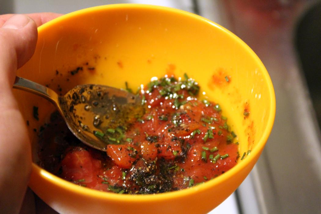 Salz, Pfeffer, Olivenöl, Oregano, Schnittlauch für die Soße zum Bestreichen der Pizza.