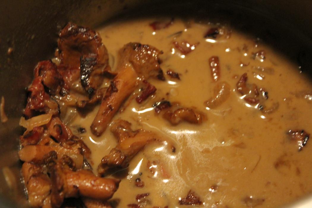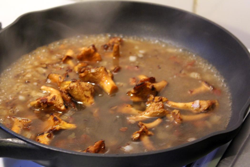 Ein paar Pfifferlinge mit der eingekochten Soße dazu auf den Teller geben.
