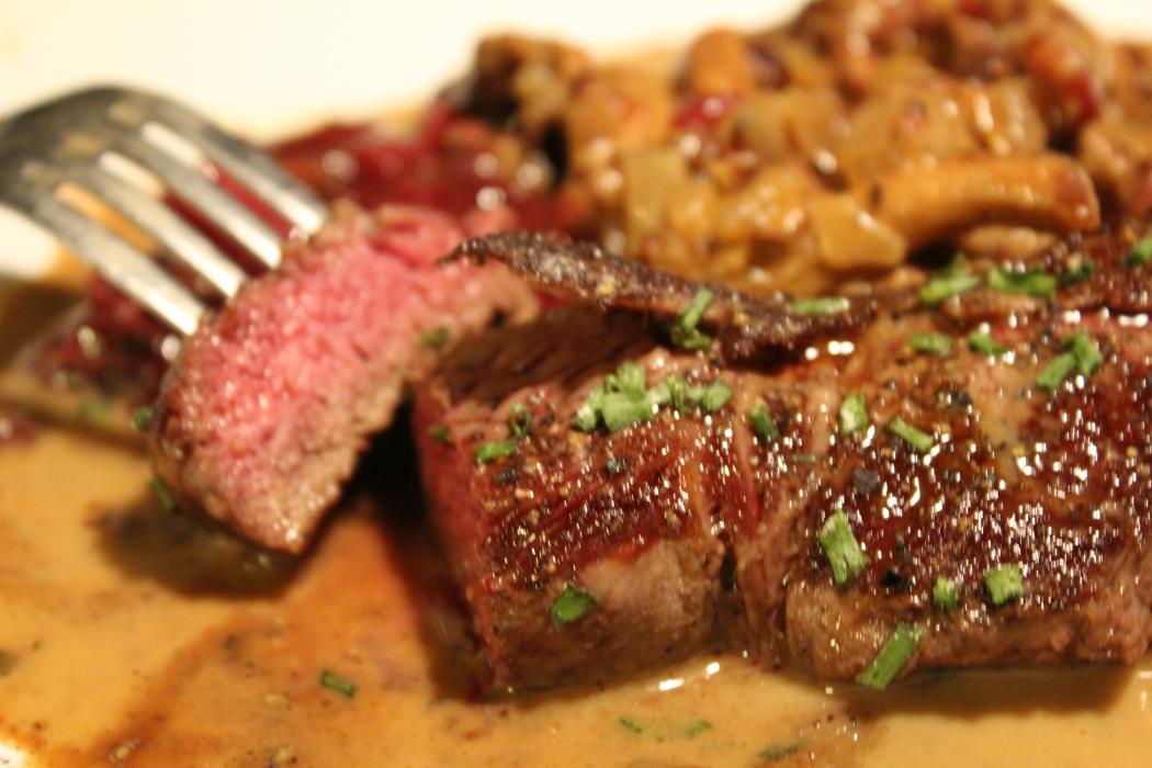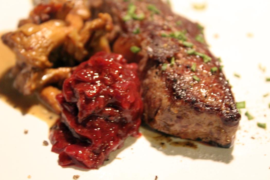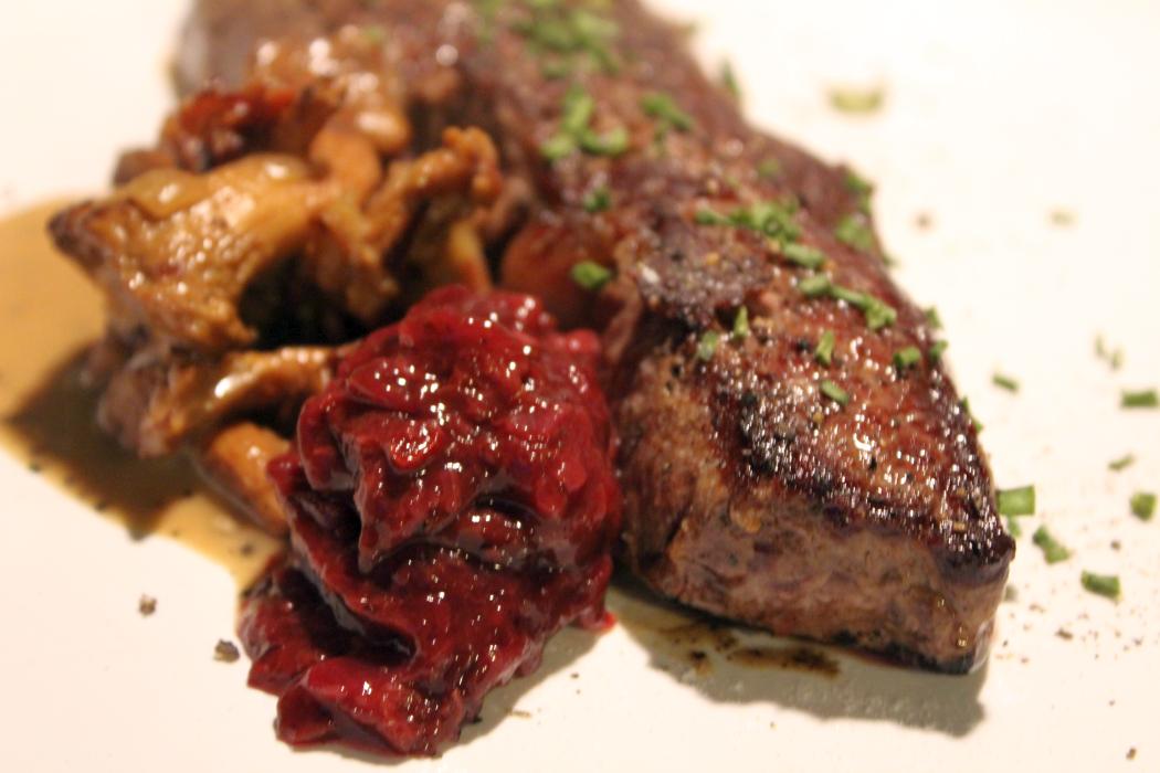 Hier ist das Steak im Anschnitt, wie gesagt genau mein Gargrad. Total zart und durch die leckeren Pfifferling und das Pflaumenchutney ein echtes Leibgericht. Das könnte ich quasi schon zum Frühstück essen. Rinderhüfte ist ja der günstigste Teil vom Rind, der sich zum Kurzbraten eignet und lebt von einer ordentlichen Zubereitung auf den Punkt. So wie man sich bei teuren Teilen vom Rind ärgern kann, wenn man sie versaut, so kann man sich hier freuen, dass es viel besser wird, als man eigentlich erwartet hätte.
