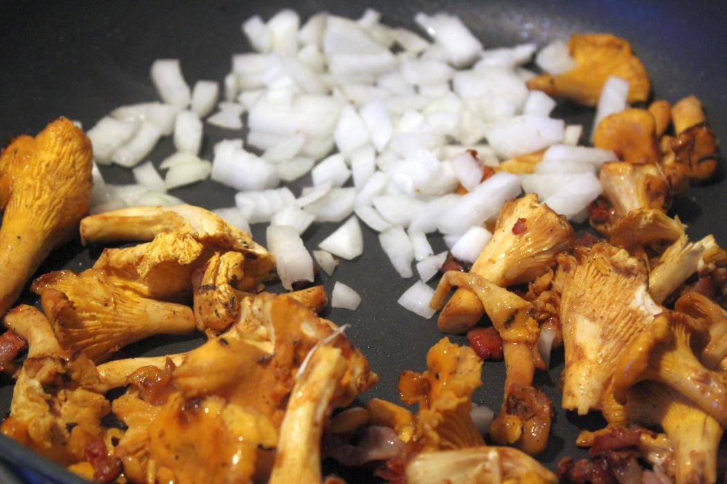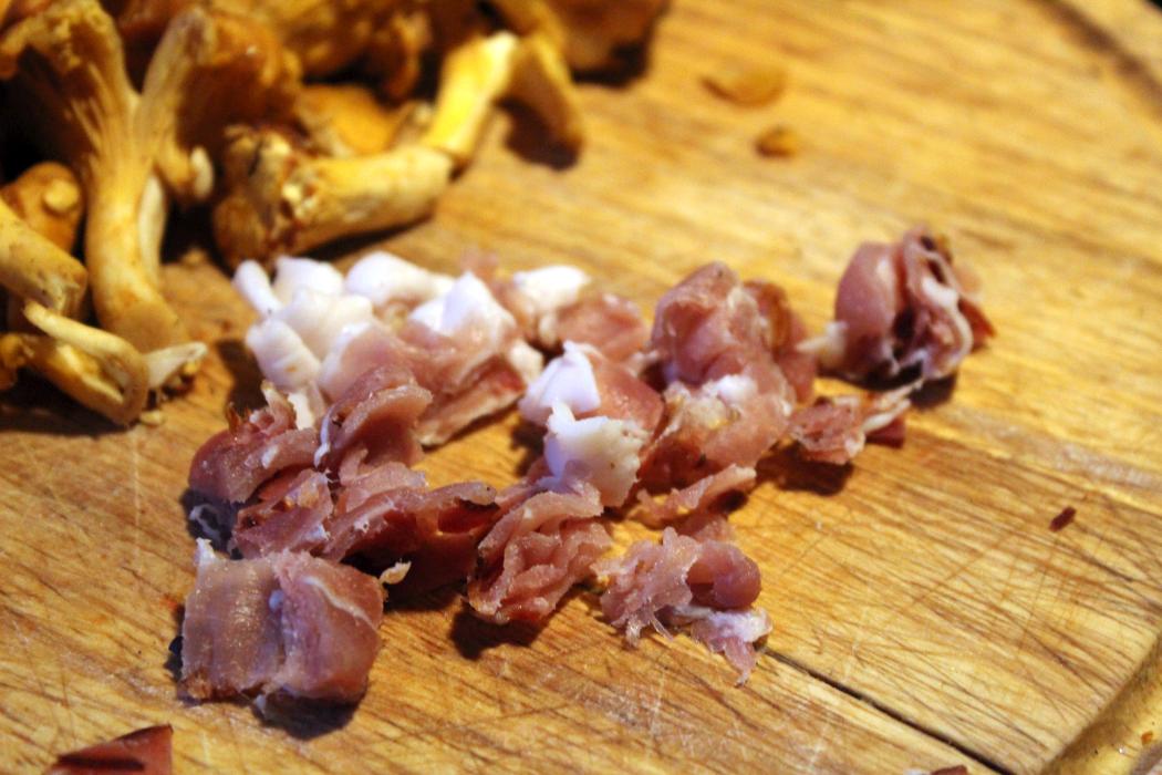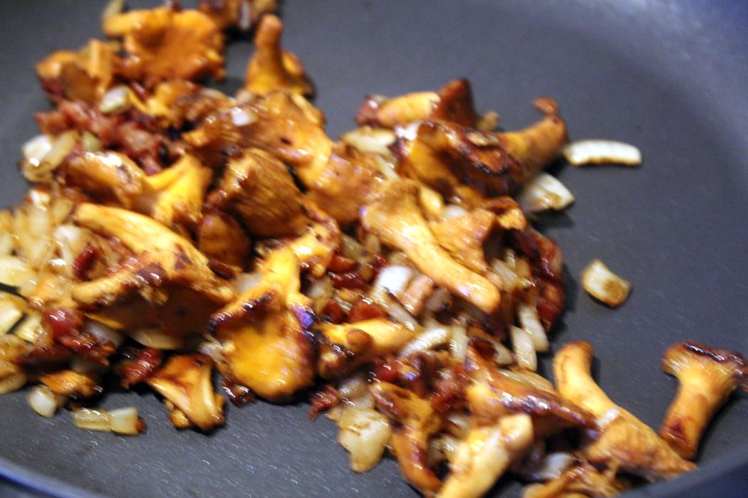 Wenn der Speck/Schinken/Bacon schon eine gesunde Gesichtsfarbe bekommt, kommen die Pfifferlinge in die Pfanne.