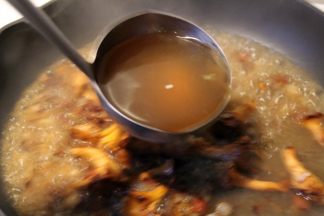 Wenn die Zwiebeln braun werden, kommt Brühe in die Pfanne, um eine Soße zu machen. Dafür liebe ich meine selbst gemachte Brühe, dass man immer den Grundstock für eine Soße hat, auch wenn das was man gerade macht, keine besondere Soßenbasis bietet.