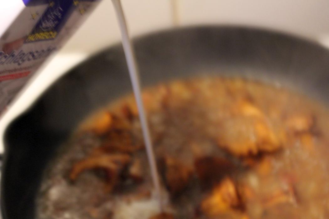 Damit die Soße bindet kommt noch ein Schuss Sahne hinein.