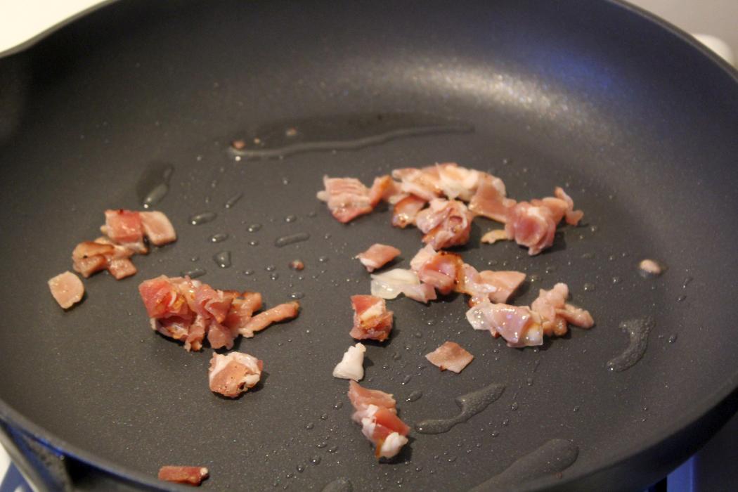 Schinken, oder Bacon, oder Speck zerkleinern und in der Pfanne auslassen.