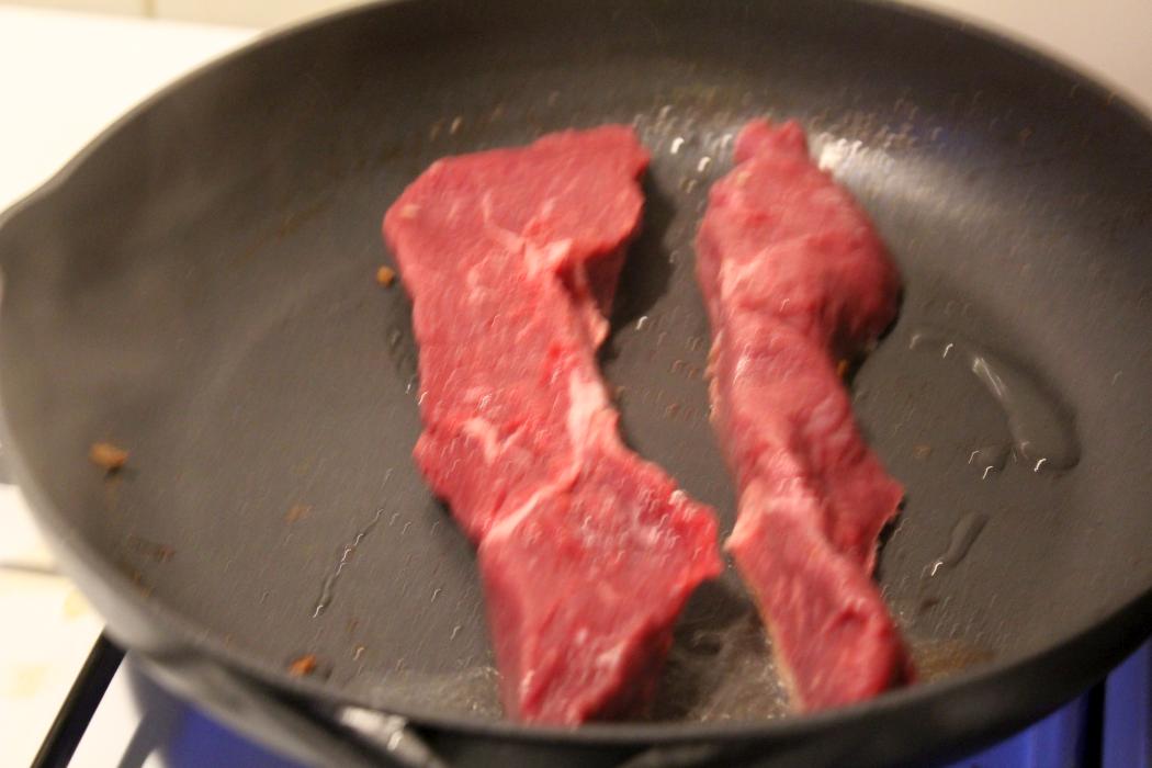 Schmalz in der Pfanne erhitzen und wenn das Fett heiß ist, die Steaks 3 Minuten pro Seite in die Pfanne legen. Wenn das Fleisch daumendick geschnitten ist, dann ist es hinterher medium, oder gerade noch medium rare. Den Ofen auf 100 Grad stellen, da lassen wir dann das Fleisch in der Restwärme ziehen, wenn es vom Herd kommt