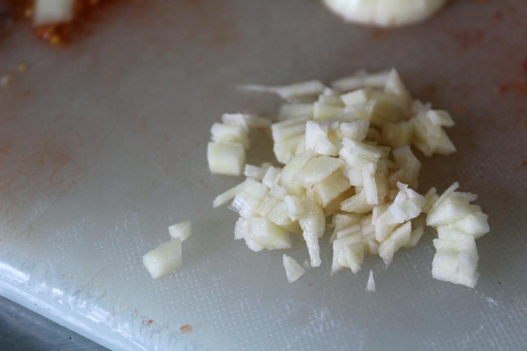 1 Knoblauch zerkleinern. Das kann eine kleine Zehe sein, oder mein ständig gedisster Freilandknoblauch.