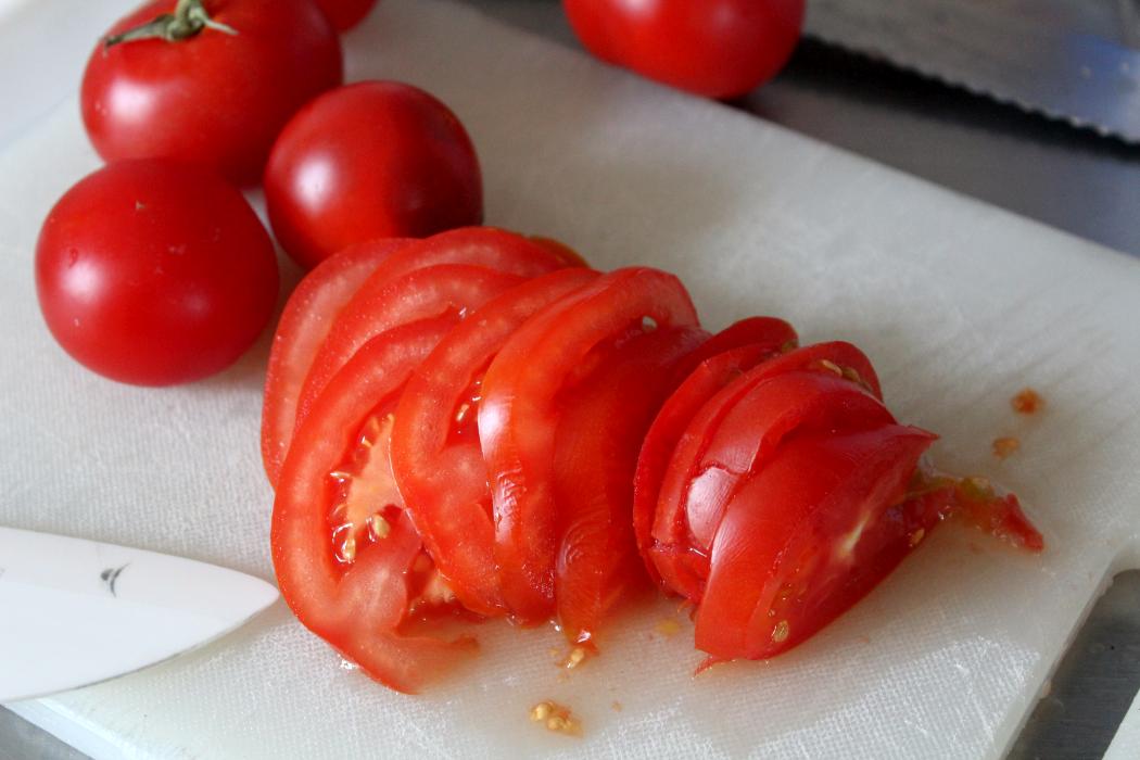 Die Auflage ist der Knaller. Frische Gartentomaten, Zwiebeln, Salz, Knoblauch und Pfeffer, mit dem geriebenen Hartkäse.