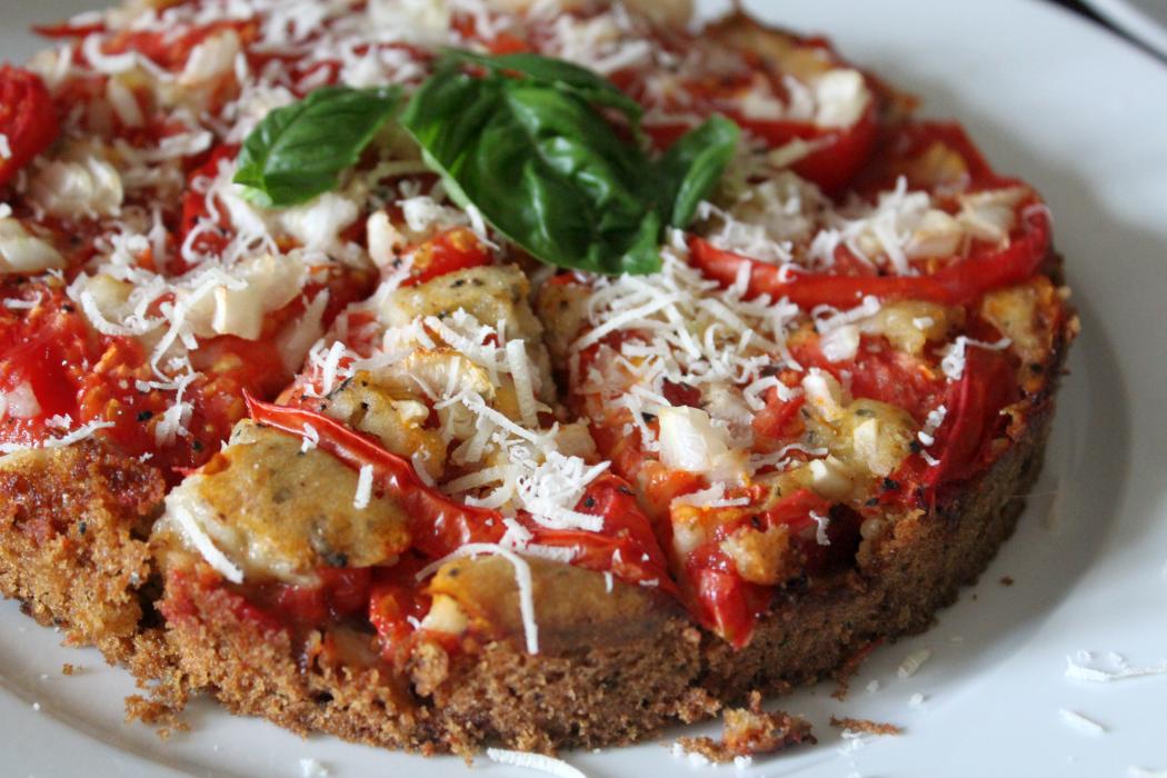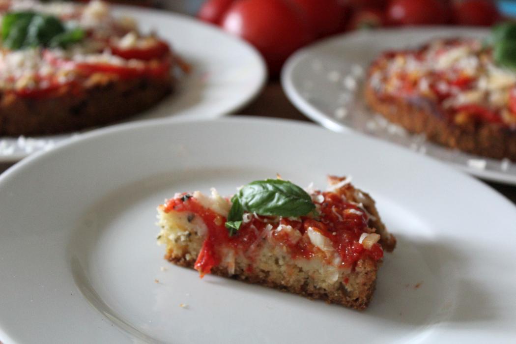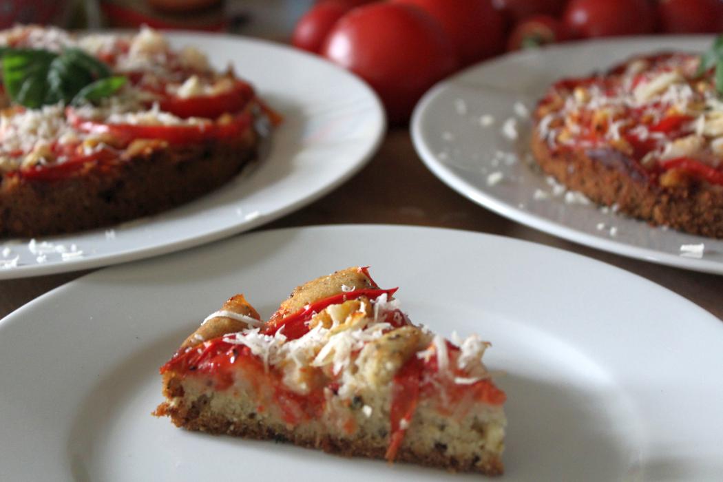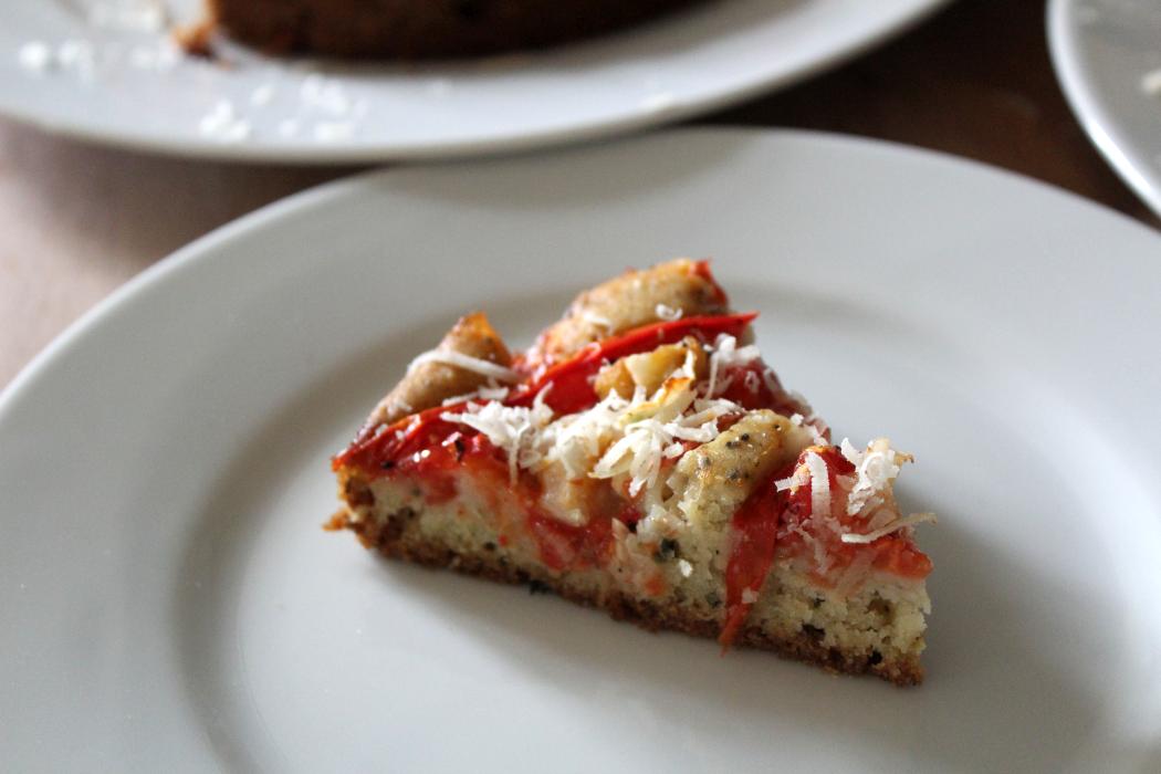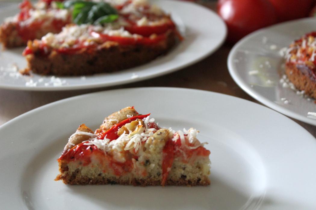 Man kann den Tomatenkuchen warm, lauwarm, oder kalt servieren. Vorher noch mit geriebenem Hartkäse bestreuen und für das Auge ein bisschen Basilikum darauf auslegen.