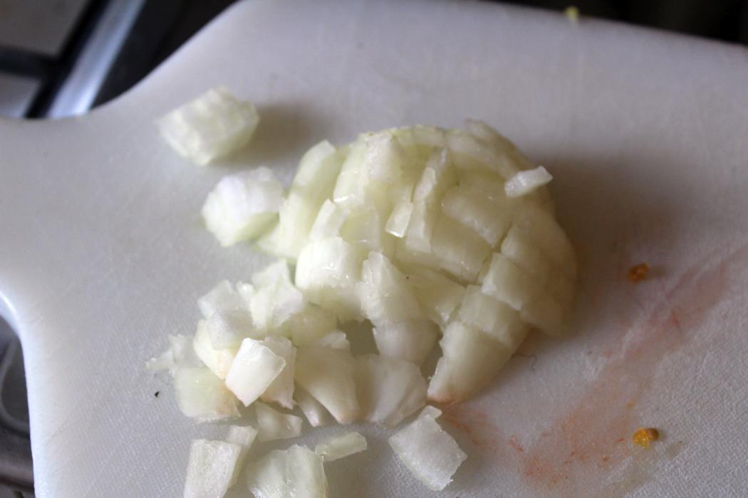 Damit die Zwiebel meinen Kindern nicht  so extrem auffällt, weil die schnell über Zwiebeln meckern, zerkleinere ich sie (die Zwiebel) für meine Verhältnisse sehr klein. Irgendwo in Schwaben zerfällt jetzt bestimmt jemand zu Staub, weil es keine Zwiebelringe, sondern leidliche Würfel sind und ja, ich habe sie vorher weder gebrüht, oder in Butter geschwenkt und ja, Ihr könnt das alle machen, wenn das Eure Oma auch so gemacht hat.