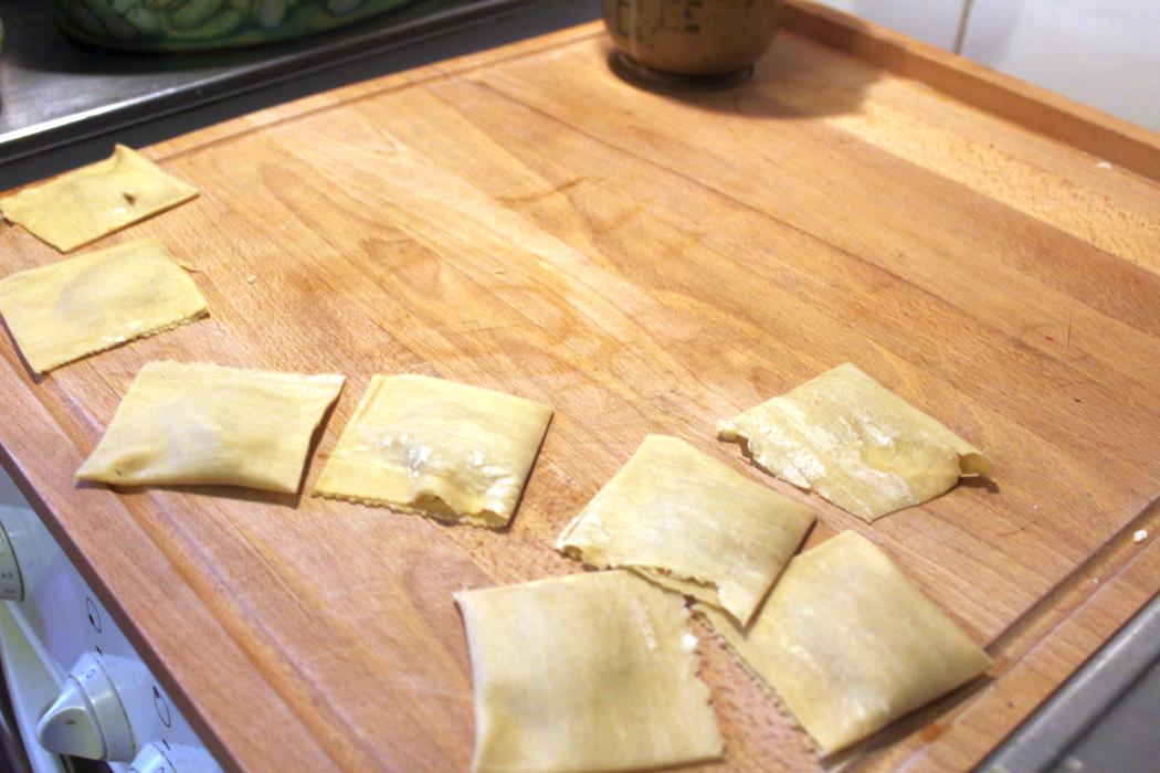 Mit einem scharfen Messer zerteilen und anschließend mit einer Gabel die Ränder verdichten. Durch das Gabelmuster gehen die Ravioli beim Kochen nicht so leicht auf. Sieht auch hübsch aus, aber das ist nur ein positiver Nebeneffekt.