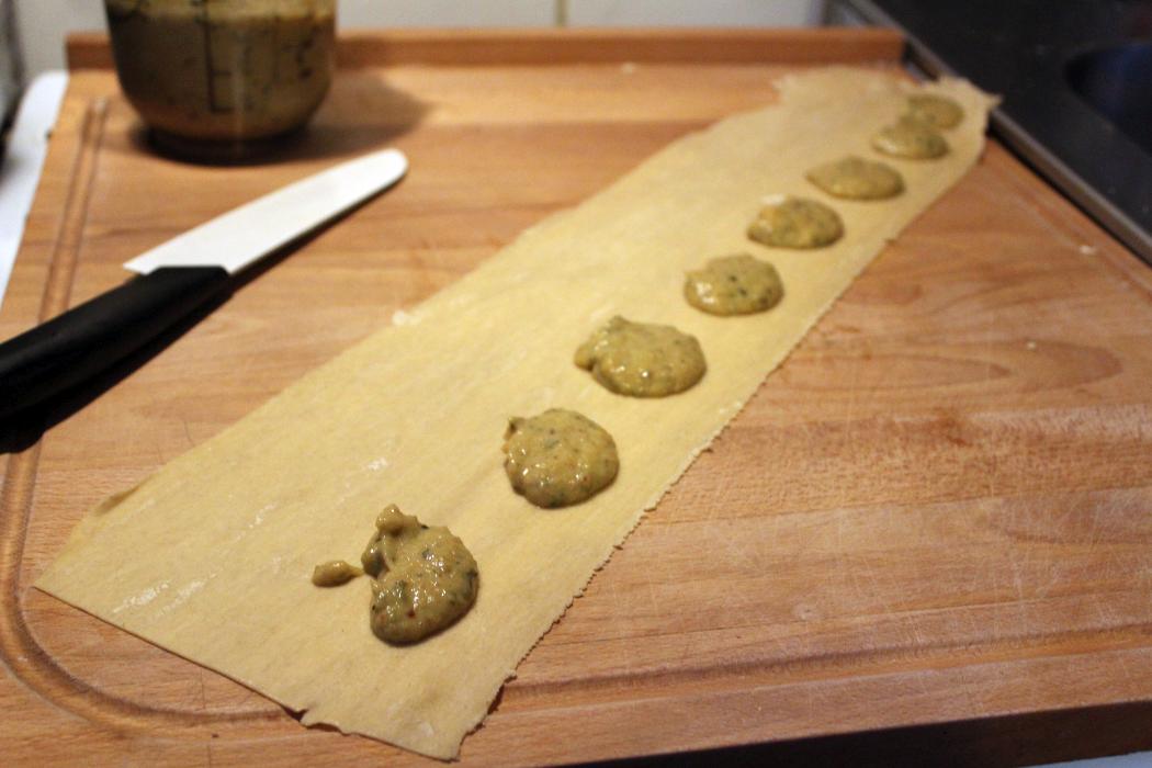 Mit einem Teelöffel die Zucchinimasse in ca 4 cm Abstand auf den Nudelteig aufbringen