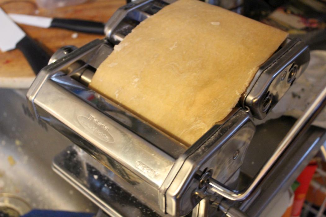 Schnell ein paar Nudelbahnen mit der Nudelmaschine walzen. Natürlich kann man auch ein Nudelholz verwenden. Wenn man den Teig schon fertig hat, ist man nach einer Stunde am Tisch. Also vorausschauend kochen und am Abend vorher schon mal einen Teig ansetzen. Das ist eine Sache von ein paar Minuten. Wenn es sein muss, braucht der auch keine Ruhezeiten, es ist nur einfacher zu verarbeiten.