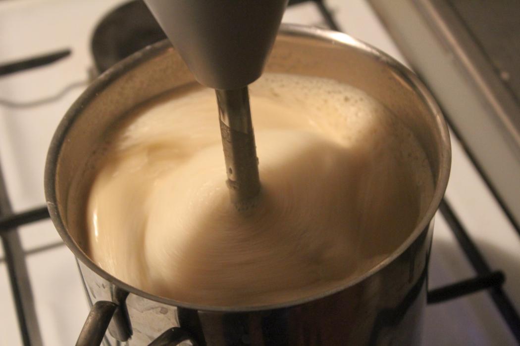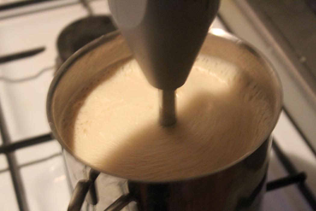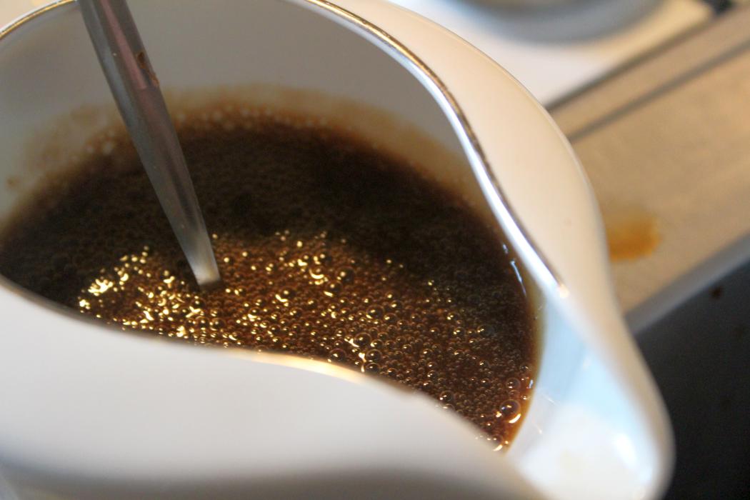 Gleich mit dem Zauberstab in den Topf gehen, einen Teelöffel Speisestärke einrühren, Zucker nach Geschmack, je nachdem wie süß Ihr Euren Kaffee trinkt, aber hier könnt Ihr es mal krachen lassen. Einfach erhitzen bis die Soße dick wird und ständig rühren. Wenn es zu dick wird, einfach nen Tick Wasser draufkippen, oder Alkohol, wenn das die Lösung ist.