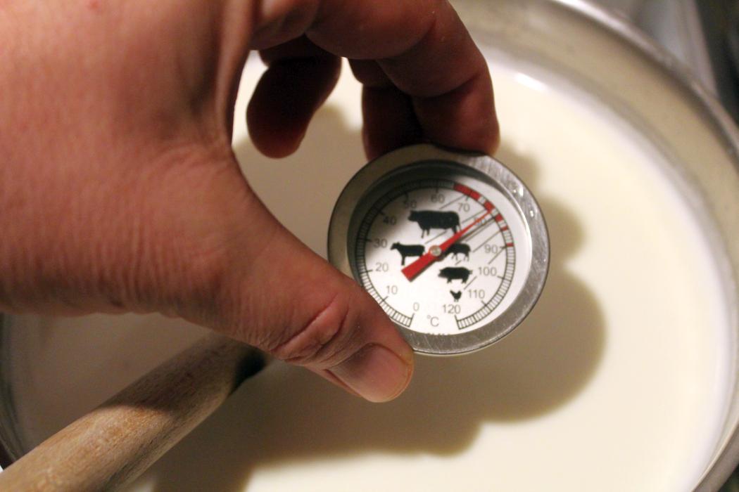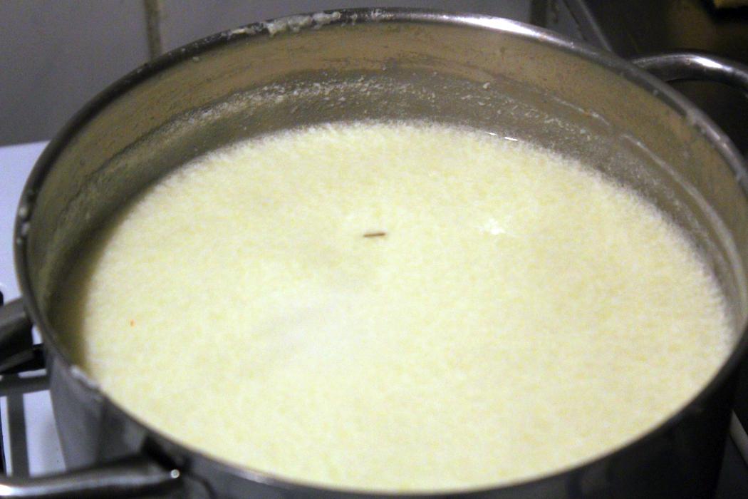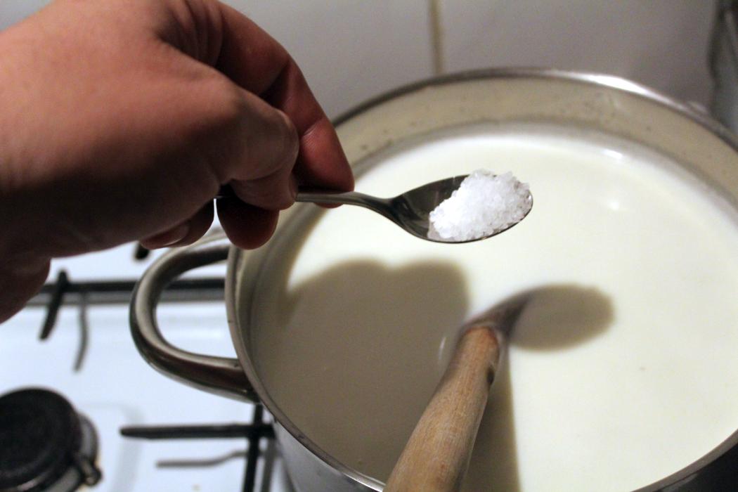 2 Liter Milch und 250 Gramm Schlagsahne auf den Herd stelle und unter ständigem Rühren erhitzen