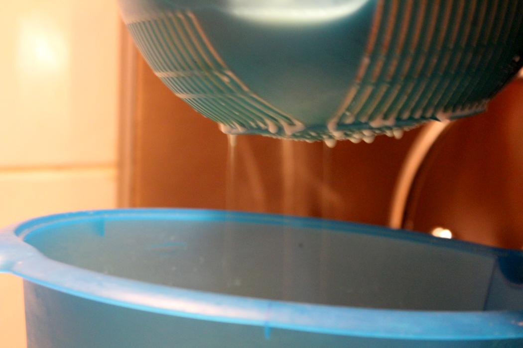 Nun muss der Milchbruch von der Flüssigkeit getrennt werden. Ich habe eine Kombination aus einer Schüssel und einem dazu passenden Sieb. Das Sieb ist mit einem Leinenhandtuch ausgelegt. Man könnte auch eine Stoffwindel benutzen. (Am besten eine unbenutzte 😉 )