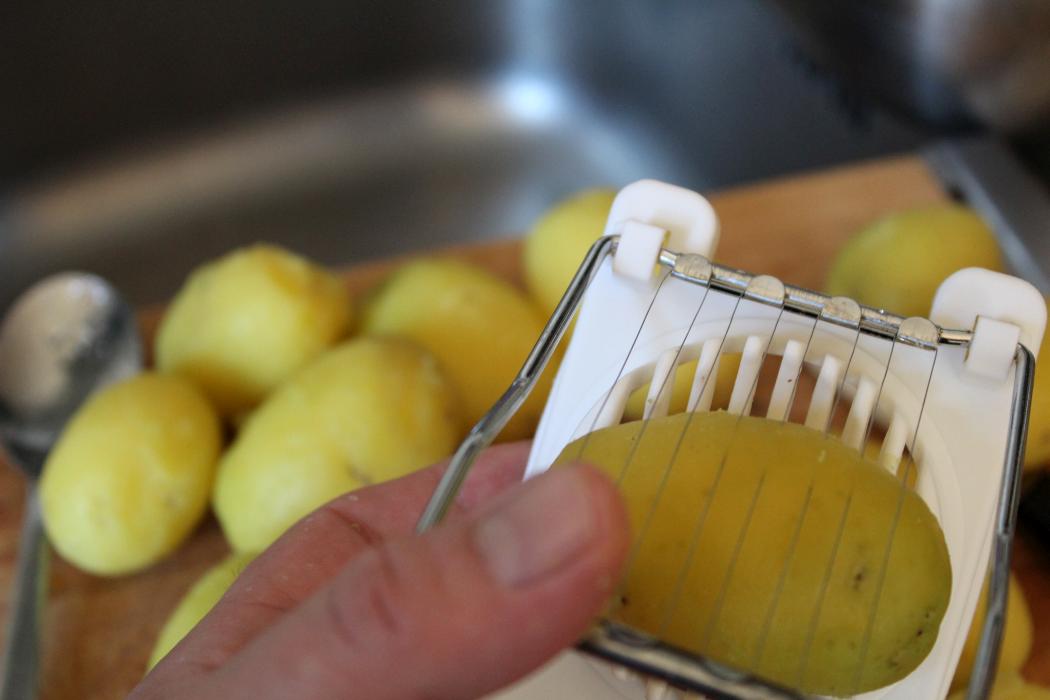 Die Kartoffeln gleichmäßig dick schneiden