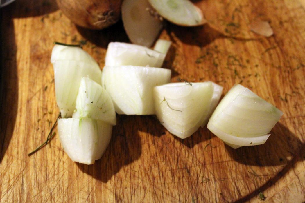 Zwiebeln häuten und zerkleinern.