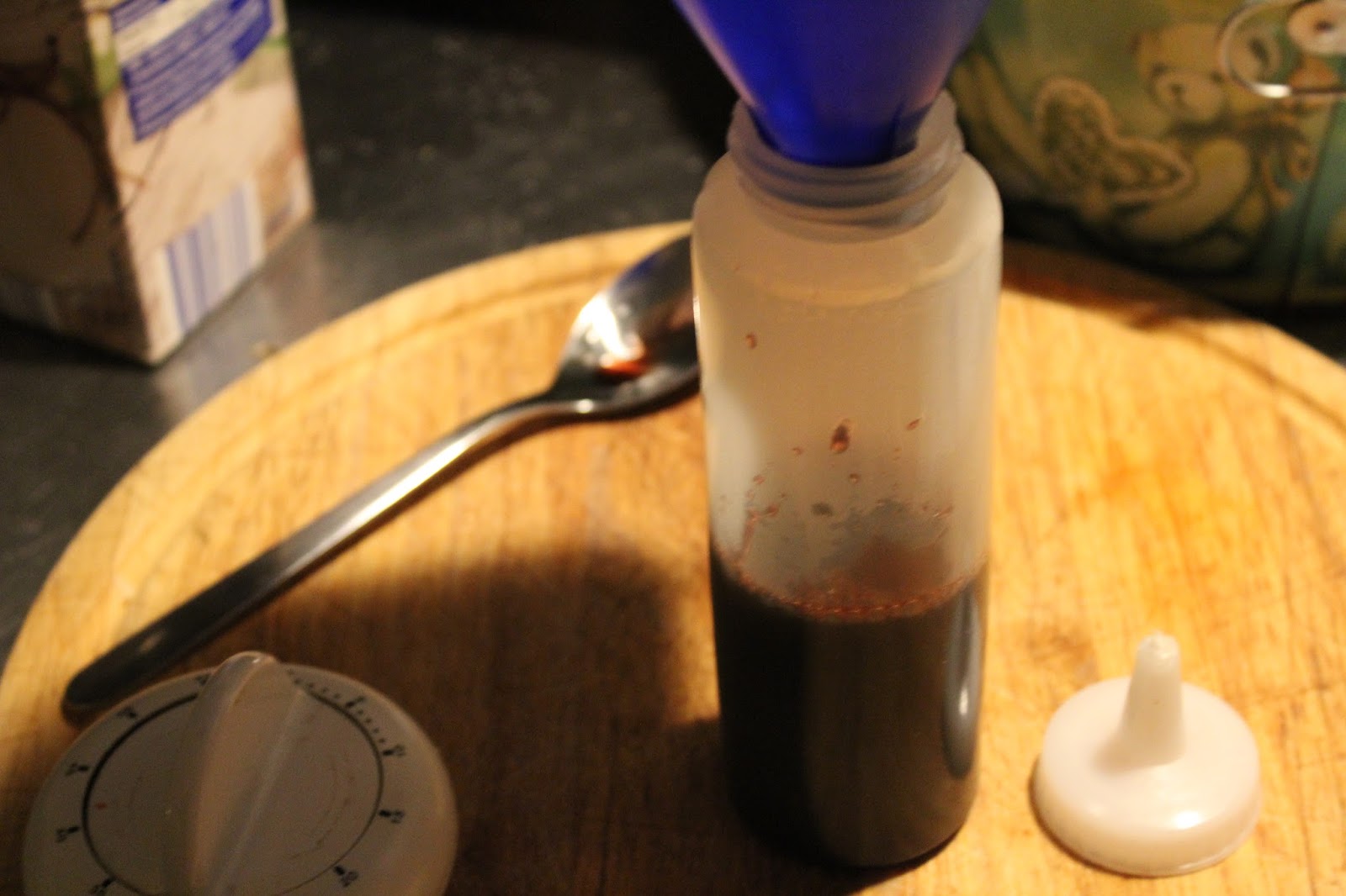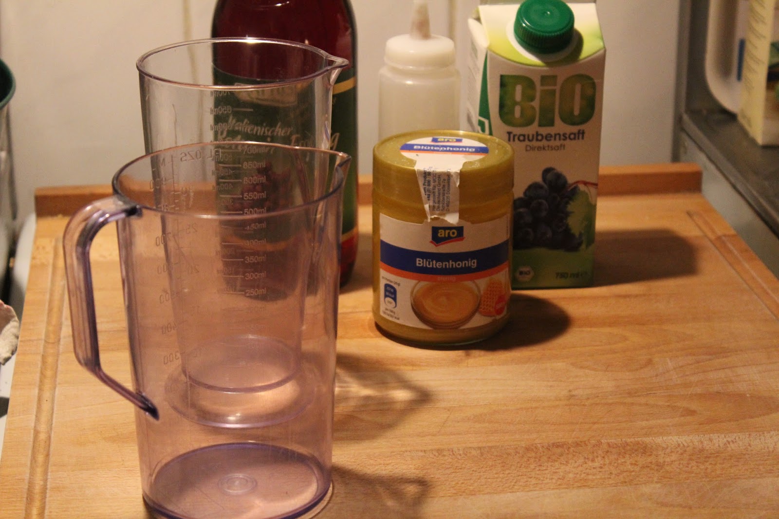 Jeweils 500 Milliliter Rotweinessig und 500 Milliliter roten Traubensaft abmessen. Ich habe mich bei beidem nicht lumpen lassen. Traubensaft in bio und rotweinessig für 4 Euro die Literflasche. Das zahlen andere nicht mal für Ihren Wein. Wenn ich bedenke, dass man Branntweinessig schon für 40 bis 60 Cent für 0,7 Liter bekommt, ist das eine echte Steigerung und für Euch ist mir ja nix zu teuer, wenn wir aus Scheiße Rosinen machen.