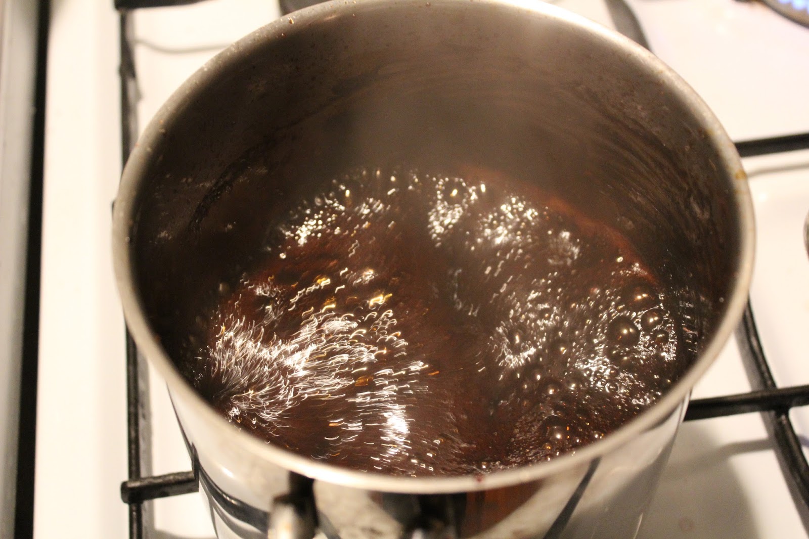 Bei niedriger bis mittlerer Hitze einkochen, also die Flüssigkeitsmenge reduzieren. Aus dem Liter Flüssigkeit macht man am Ende 150 Milliliter rote Balsamicocreme. Regelmäßiges umrühren ist wichtig, damit nichts am Topfboden anbrennt.
