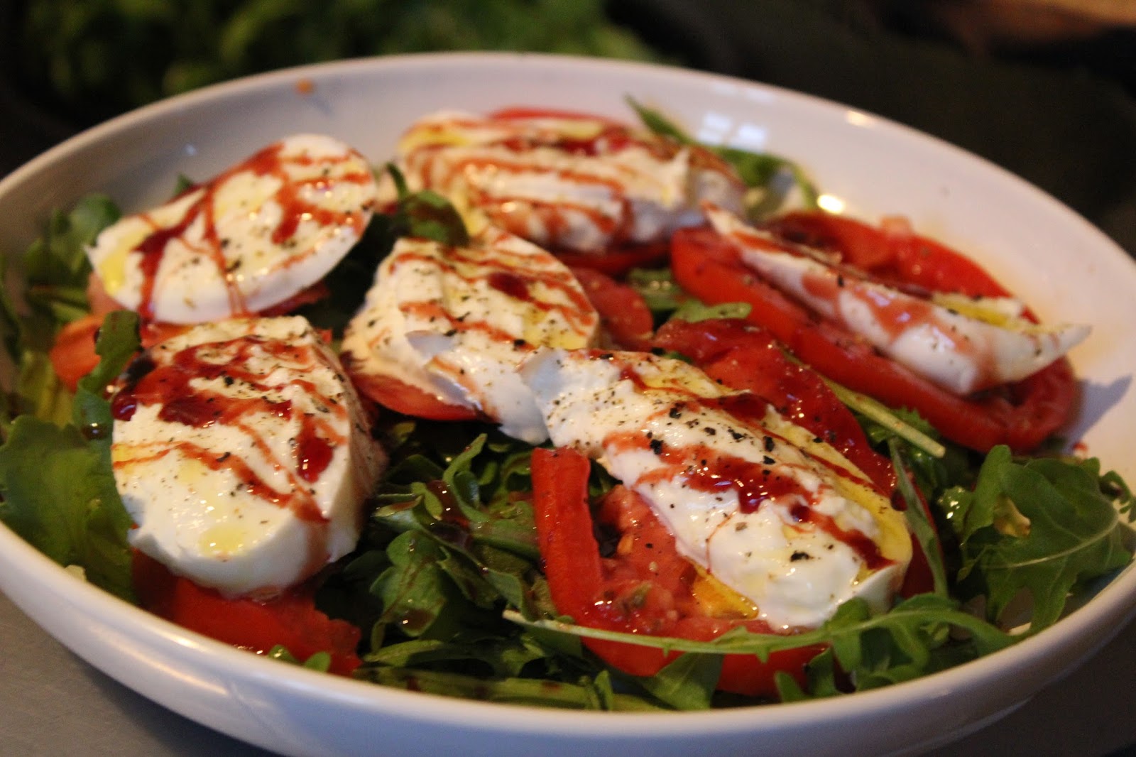 Zum Geschmackstest benutze ich ganz klassisch Tomate Mozzarella auf einem Rucolabett