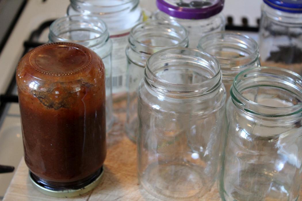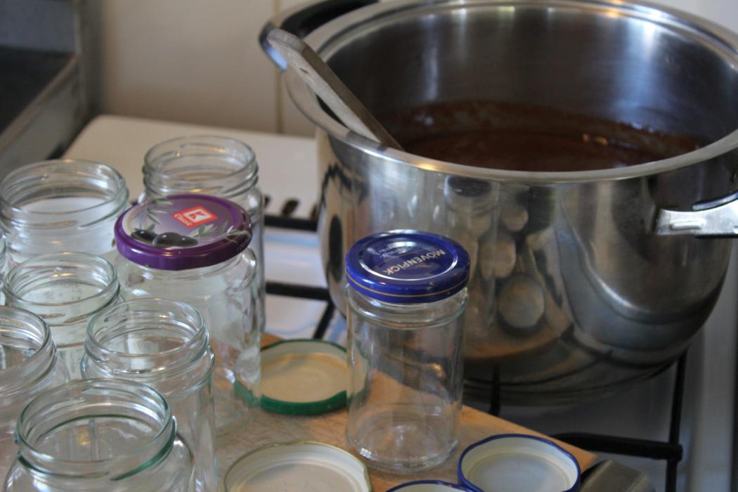 Die Marmeladengläser und Deckel in kochendem Wasser steril machen