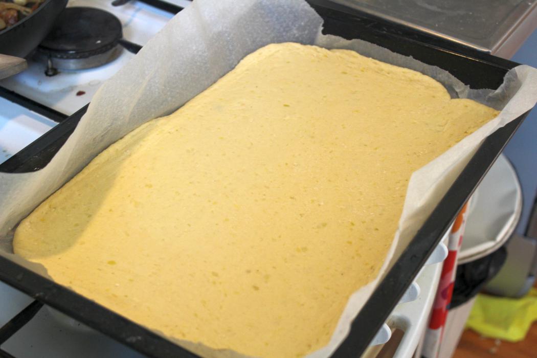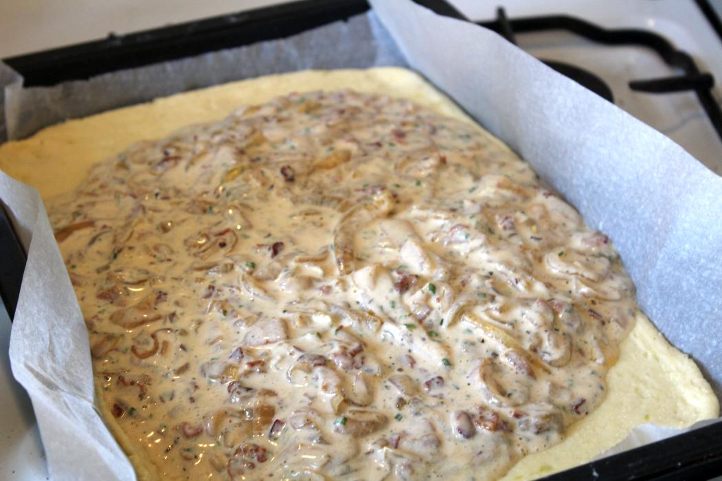 Nun kommt die Zwiebelmasse auf den Kartoffelteig