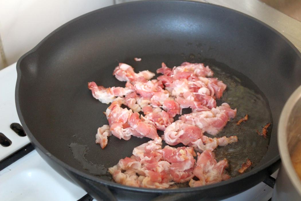 100 Gramm Bacon. Den kann man als Vegetarier auch weglassen, oder als Fleischjunkie verdoppeln, oder verdreifachen. Ich hatte nur 100 Gramm im Kühlschrank und habe meinen guten Willen bewiesen.