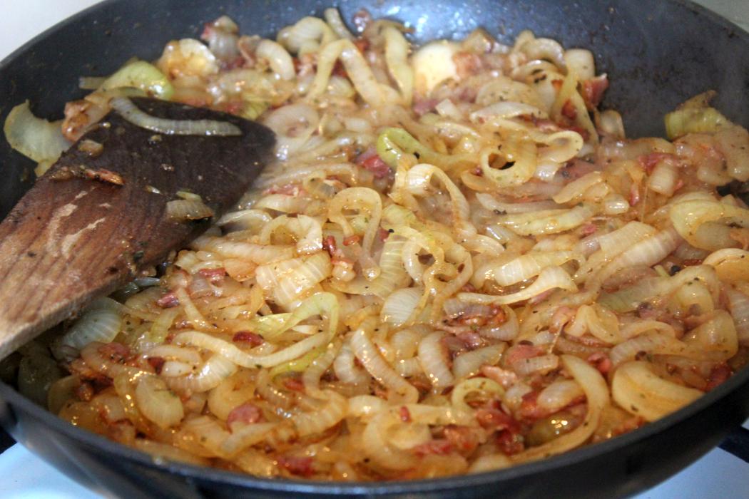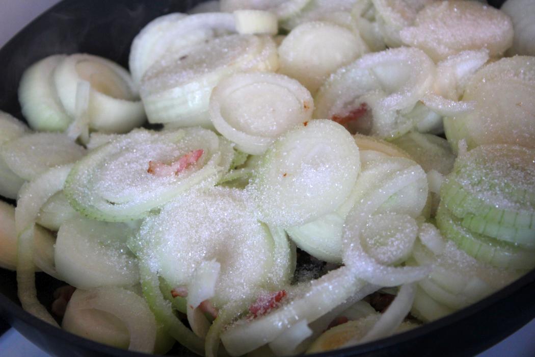 Zucker über die Zwiebeln geben, damit die Zwiebeln karamellisieren können. Darauf besteht meine Frau, weil sie den fränkischen Zwiebelkuchen quasi mit der Muttermilch aufgenommen hat.