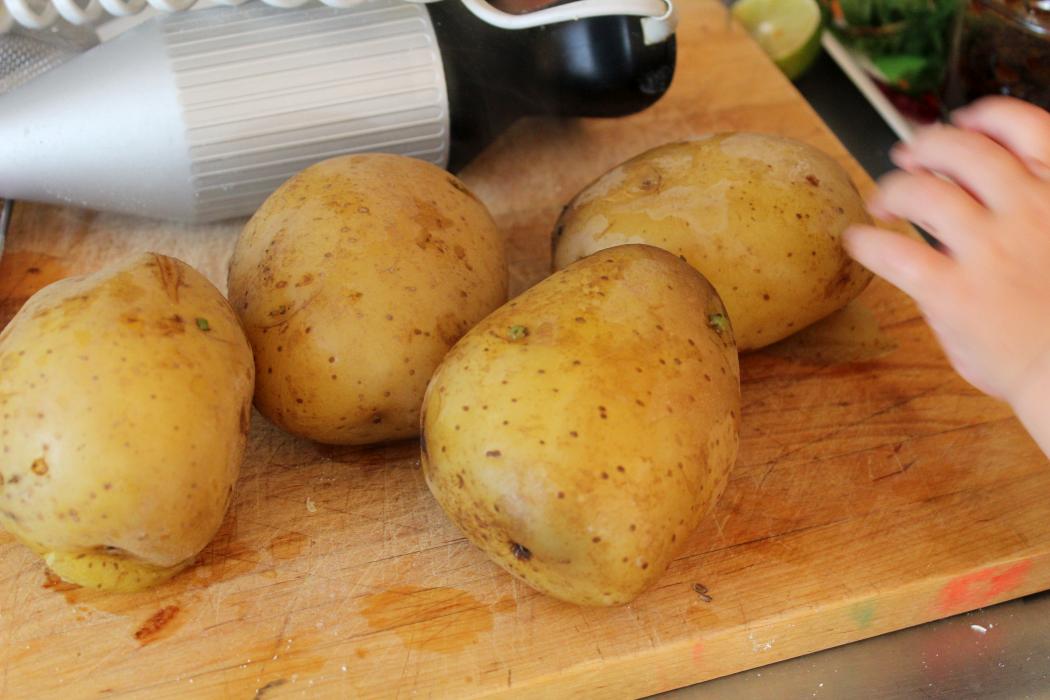 500 Gramm Kartoffeln als Pellkartoffeln kochen. Ich habe gleich ein paar mehr gekocht, also nicht verwirren lassen. Kalt aufsetzen mit Salzwasser und wenn es kocht, je nach dicke zwischen 20 und 30 Minuten kochen lassen. Meine Kartoffeln waren ganz schöne Klopper, die habe ich 30 Minuten kochen lassen.