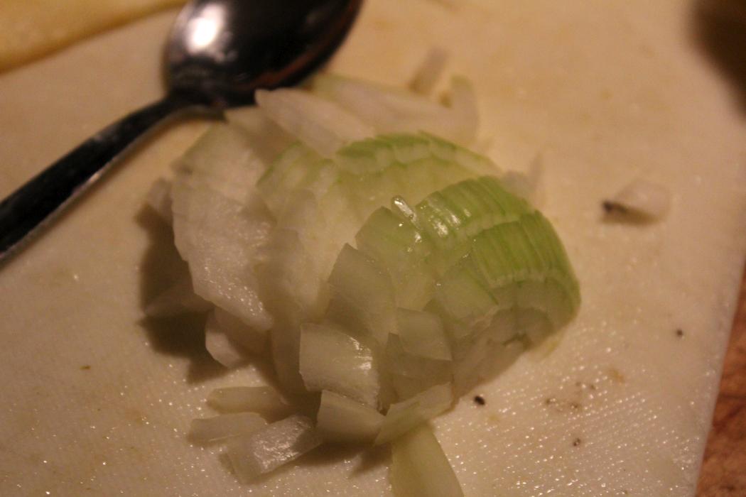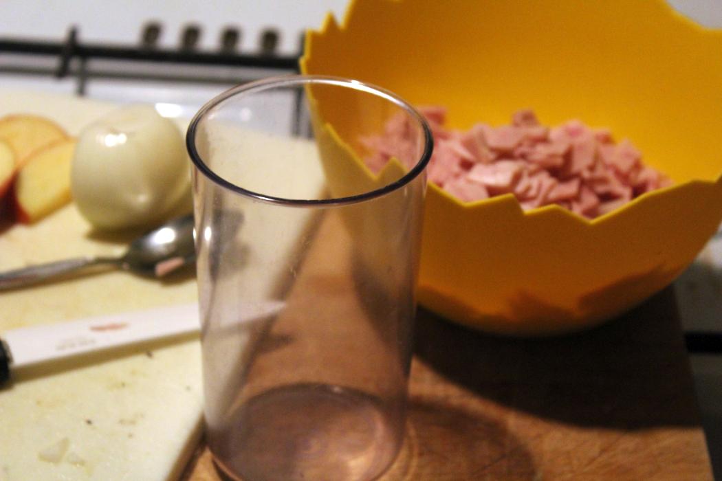 Wurst zerkleinern. Da ich vorher auch noch nicht wusste, dass ich an dem Abend so einen Salat mache, habe ich auch keine besondere Wurst am Start, sondern das was mich die Kinder immer zum Kaufen nötigen. Immerhin ist das mit frischem Apfel, frischer Zwiebel, Mayonnaise ohne Plaste und Elaste und selbst eingelegten Gurken. Wer jetzt noch einen Schlachter kennt, der seine Wurst ohne Sägemehl macht, hat die Nase vorn. Mir fällt dann spontan Kalieber als Wurstlieferant ein, wenn man eine bessere Qualität haben möchte.