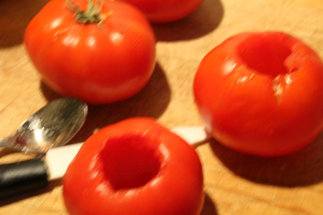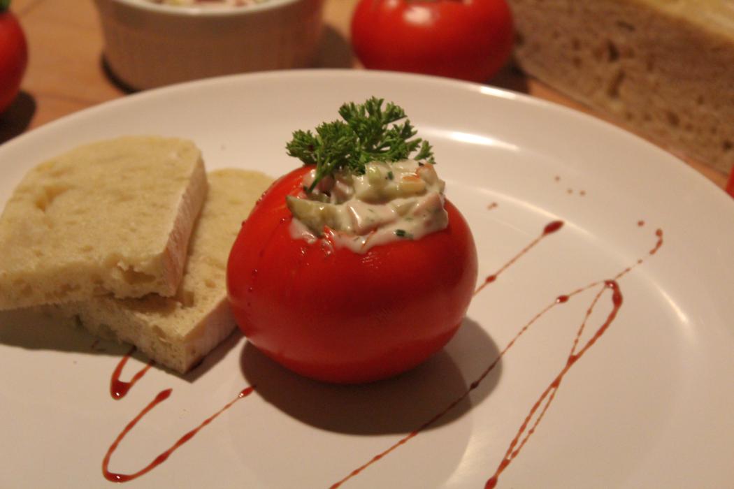 Hier noch einmal malerisch die gefüllten Tomaten mit Fleischsalat